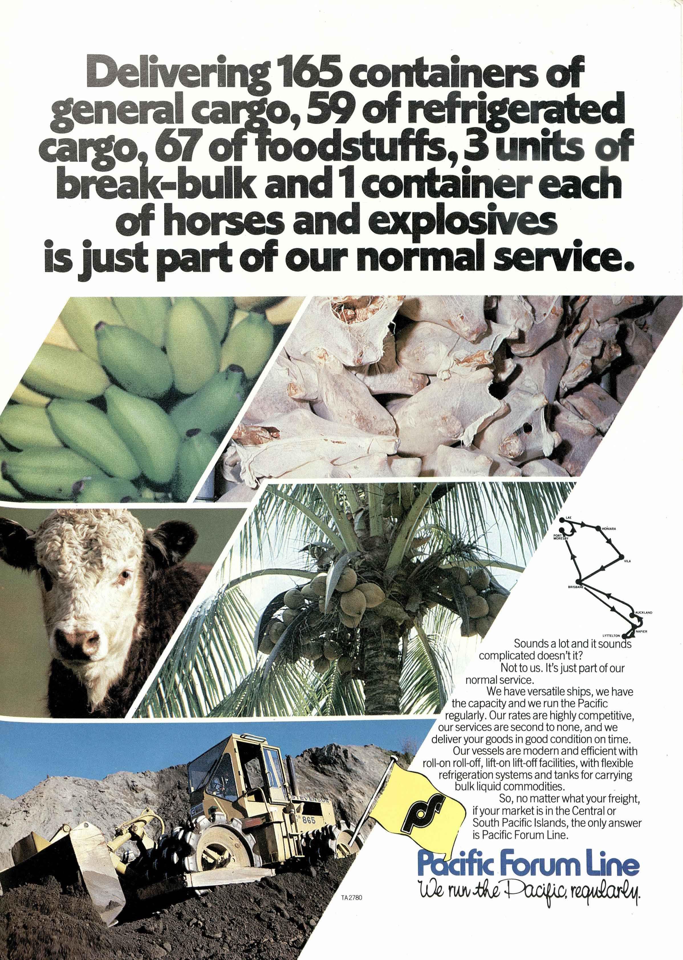~~!i_!,V Ourvesselsaremodernand efficientwith roll-onroll-off,lift-onlift-offfacilities,withflexible refrigerationsystemsandtanksfor carrying bulkliquidcommodities. . So,no matterwhatyourfreight, if yourmarketis in the Centralor SouthPacificIslands,the onlyanswer is PacificForumLine.