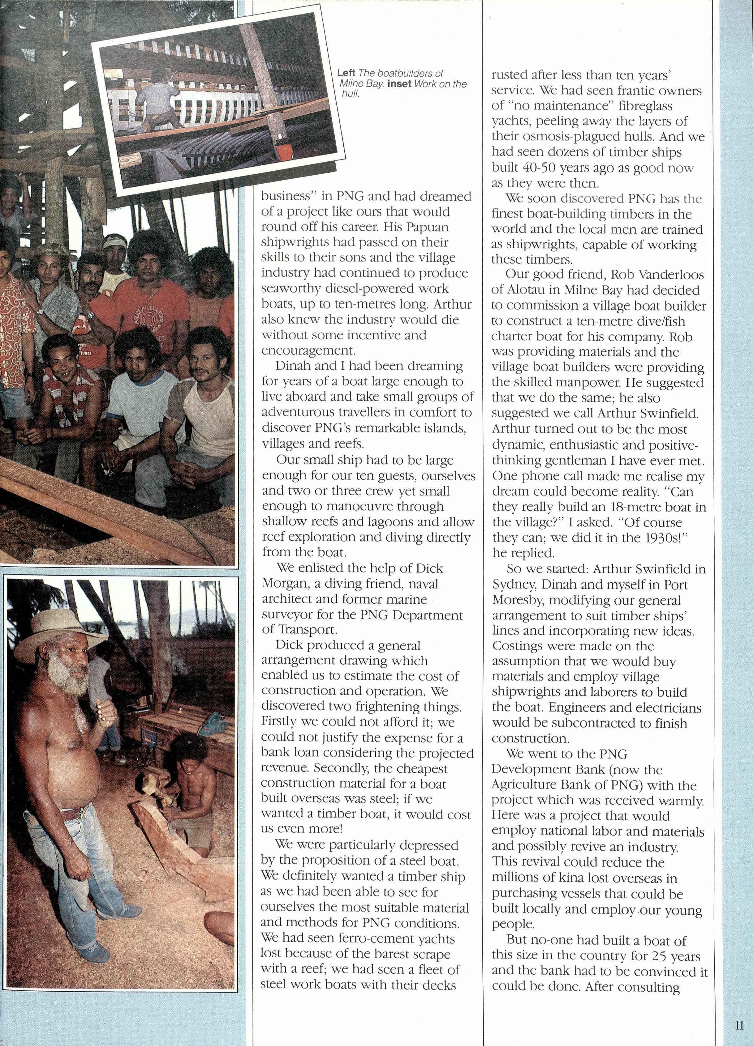 We went to the PNG Development Bank (now the Agriculture Bank of PNG) with the project which was received warmly. Here was a project that would employ national labor and materials and possibly revive an industry. This revival could reduce the millions of kina lost overseas in purchasing vessels that could be built locally and employ our young people.