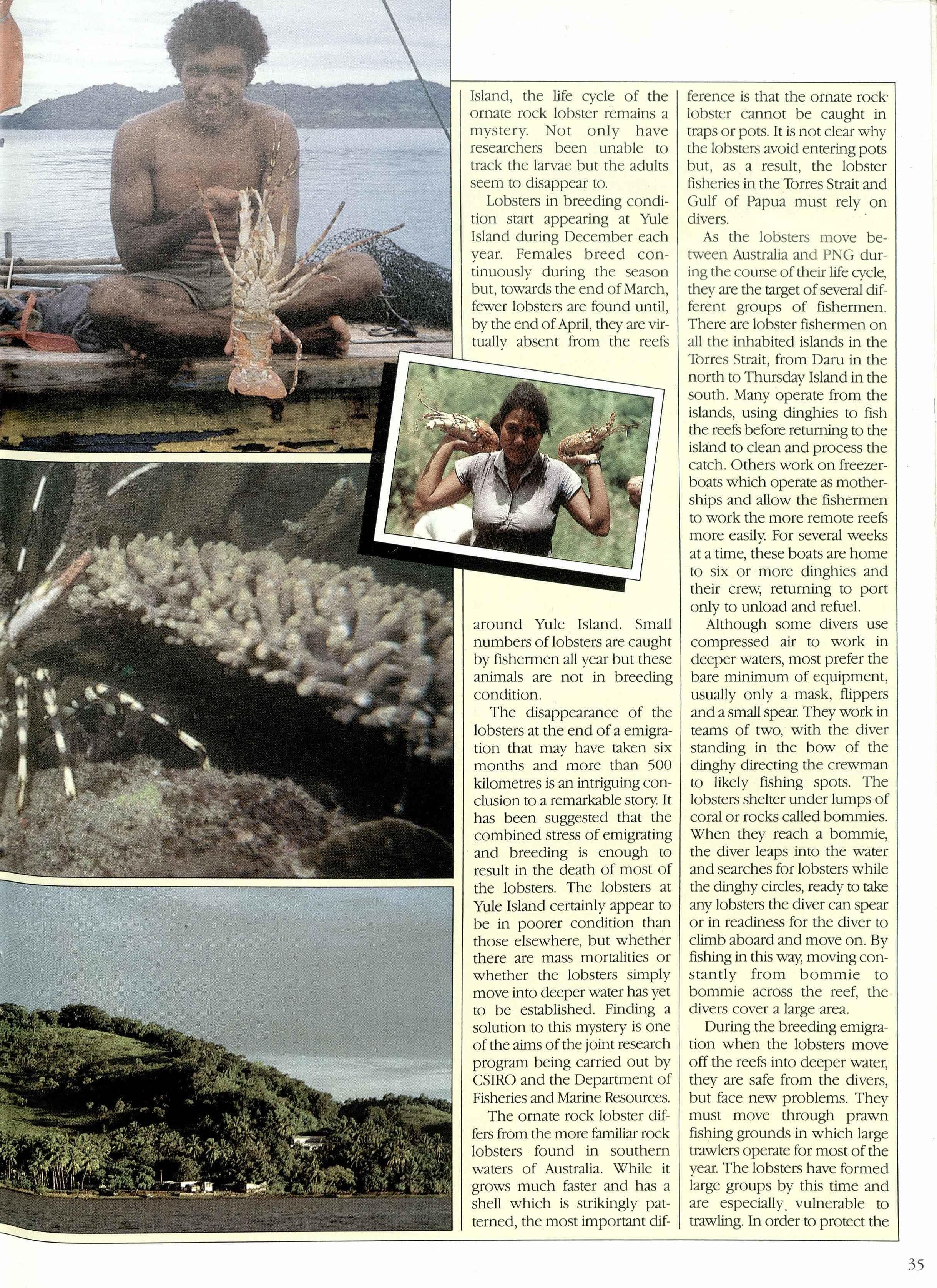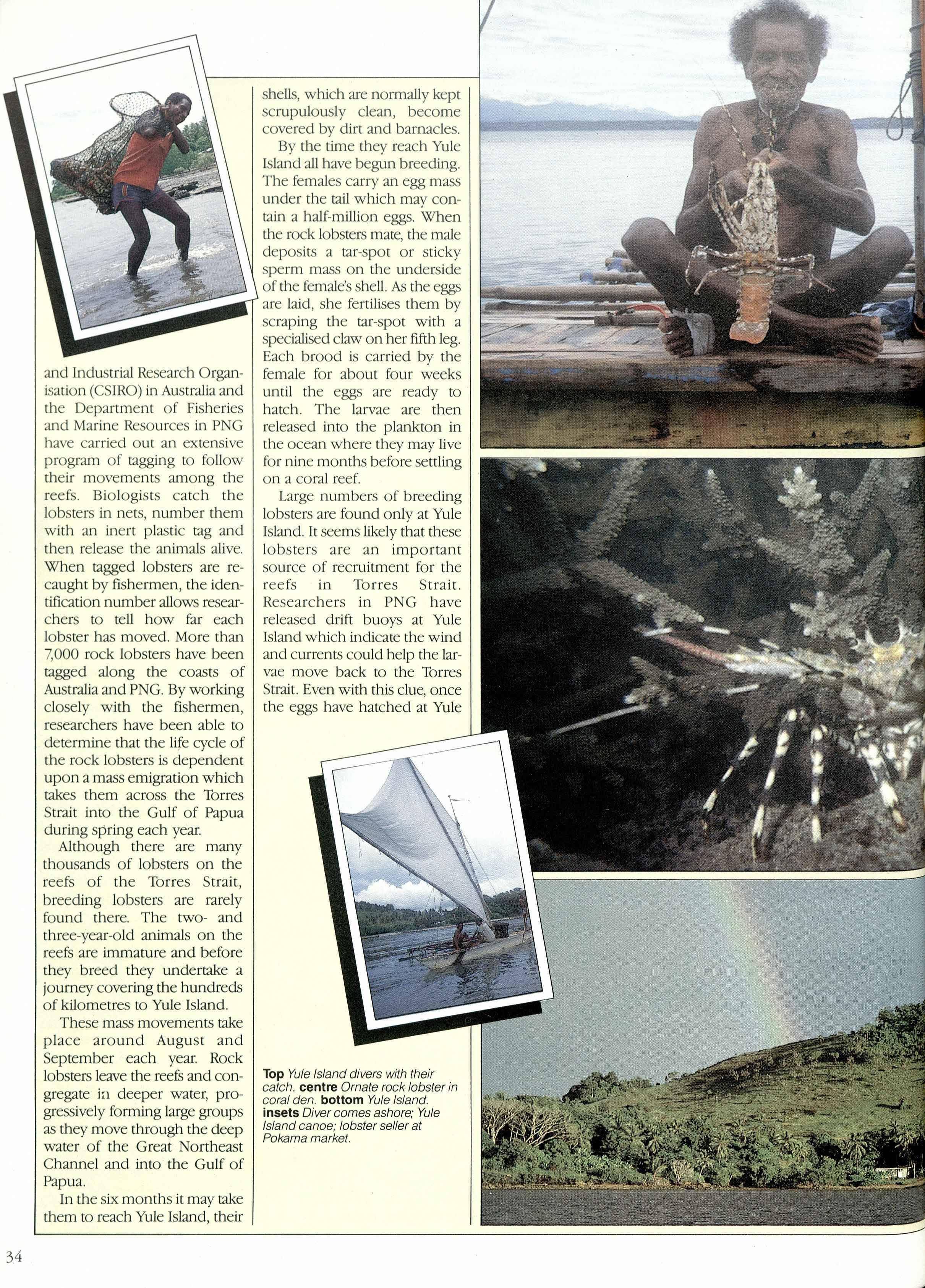 and Indu trial Research Organisation (C IRO) in Australiaand the D partmenc of Fisheries and Marine Resources in PNG have carried out an extensive program of tagging to follow their movements among the reefs. Biologists catch the lobsters in nets, number them with an inert plastic tag and then release the animals alive. When tagged lobsters are recaught by fishermen, the identification nwnber allows researchers to tell how far each lobster has moved. More than 7,000 rock lobsters have been tagged along the coasts of Australiaand PNG. By working closely with the fishermen, researchers have been able to determine that the life cycle of the rock lobsters is dependent upon a mass emigration which takes them across the Torres trait into the Gulf of Papua during spring each year.