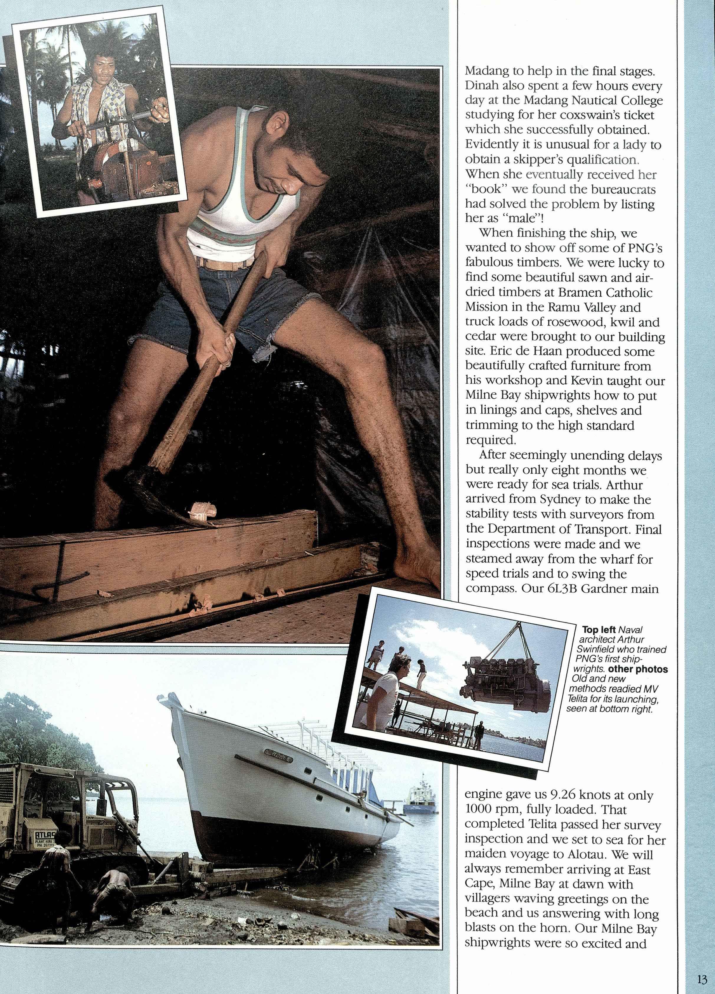 engine gave us 9.26 knots at only 1000 rpm, fully loaded. That completed Telita passed her survey inspection and we set to sea for her maiden voyage to Alotau. We will always remember arriving at East Cape, Milne Bay at dawn with villagers waving greetings on the beach and us answering with long blasts on the horn. Our Milne Bay shipwrights were so excited and