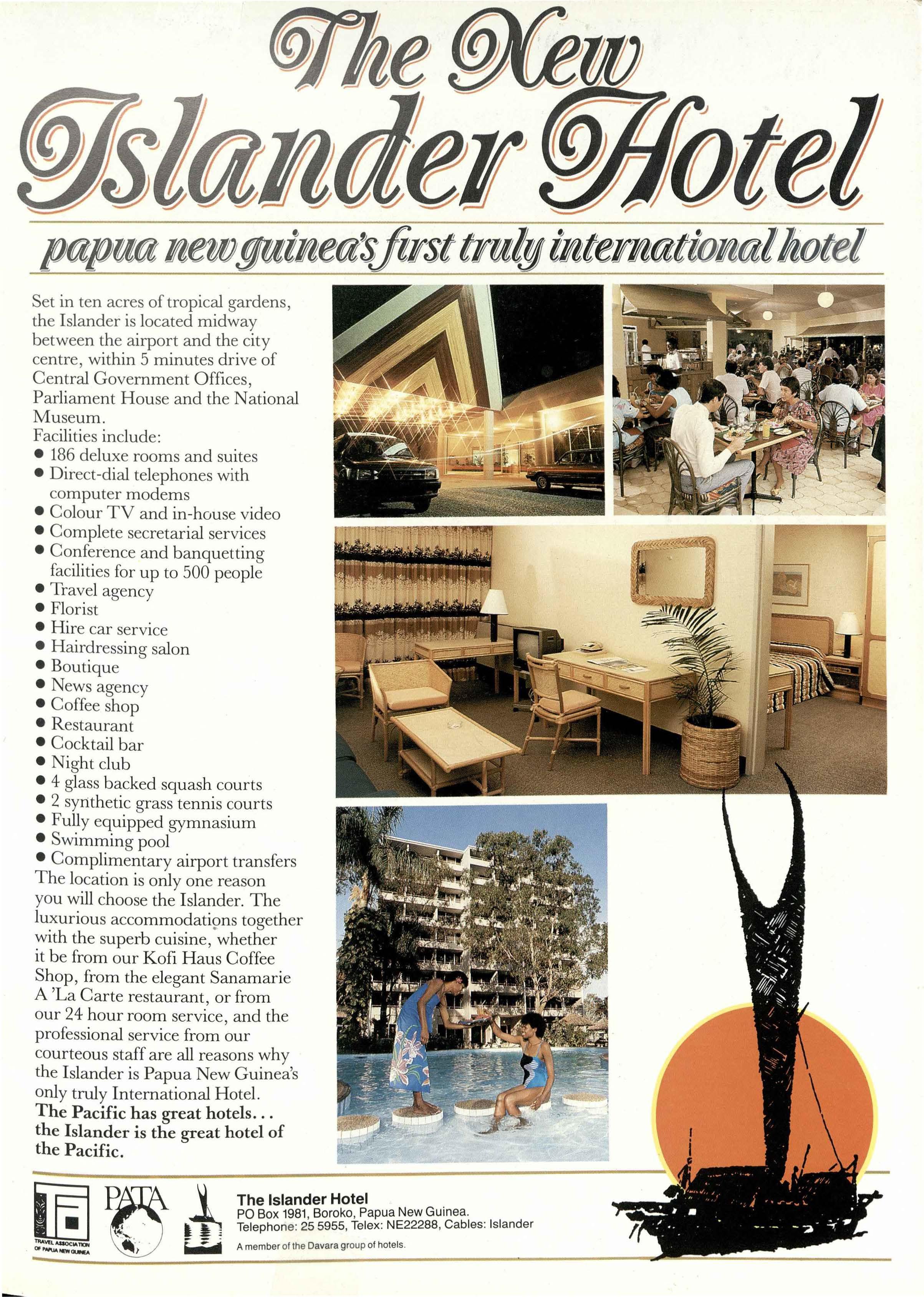 A 'La Carte restaurant, or from our 24 hour room service, and the professional service from our courteous staff are all reasons why the Islander is Papua New Guinea's only truly International Hotel. The Pacific has great hotels ... the Islander is the great hotel of the Pacific.