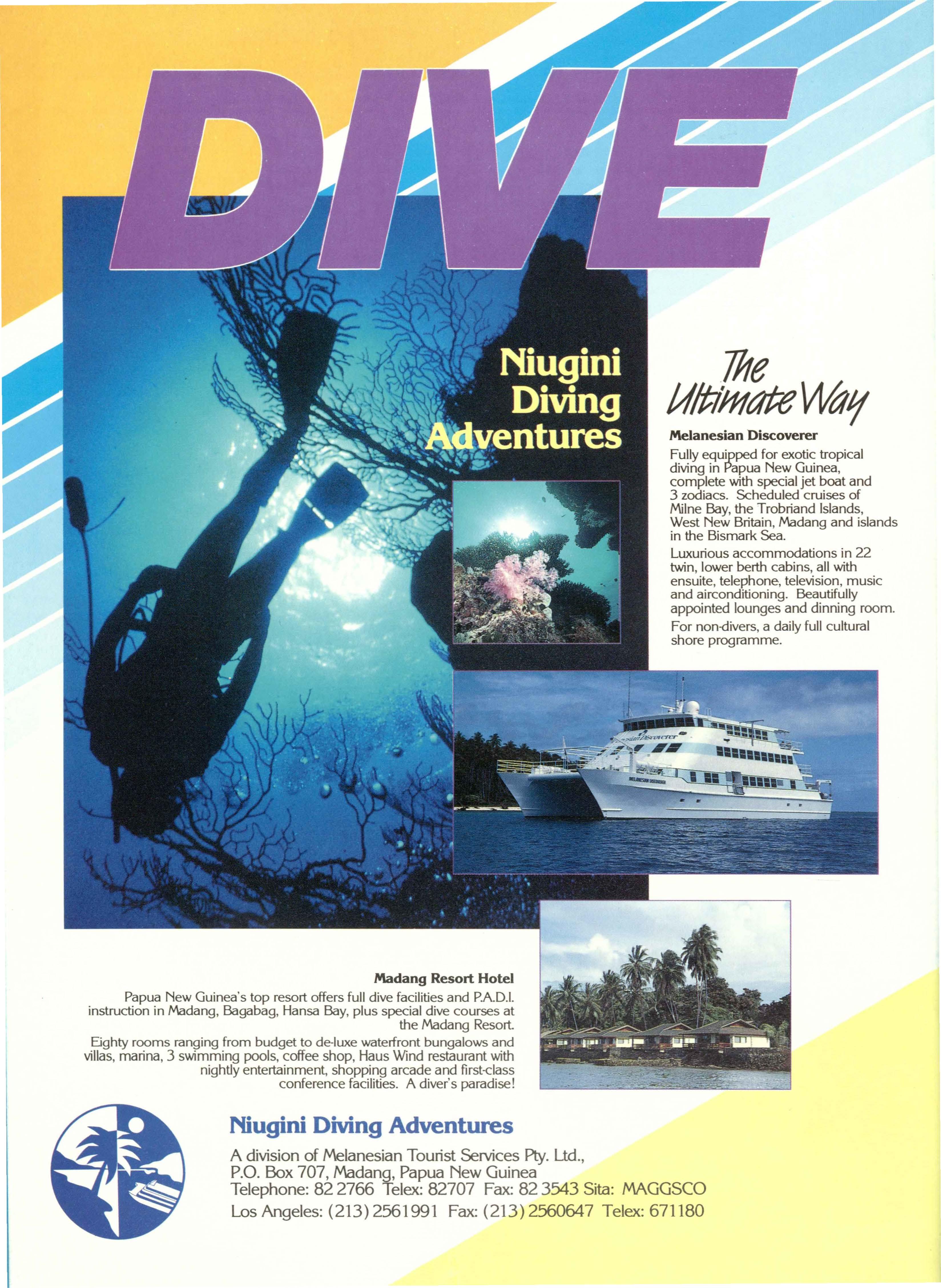 Luxurious accommodations in 22 twin, lower berth cabins, all with ensuite, telephone, television, music and airconditioning. Beautifully appointed lounges and dinning room. For non-divers, a daily full cultural shore programme. I A division of Melanesian Tourist Services Pty.Ltd., P.O. Box 707, Madang, Papua New Guinea Telephone: 82 2766 Telex: 82707 Fax: 82 3543 Sita: MAGGSCO I