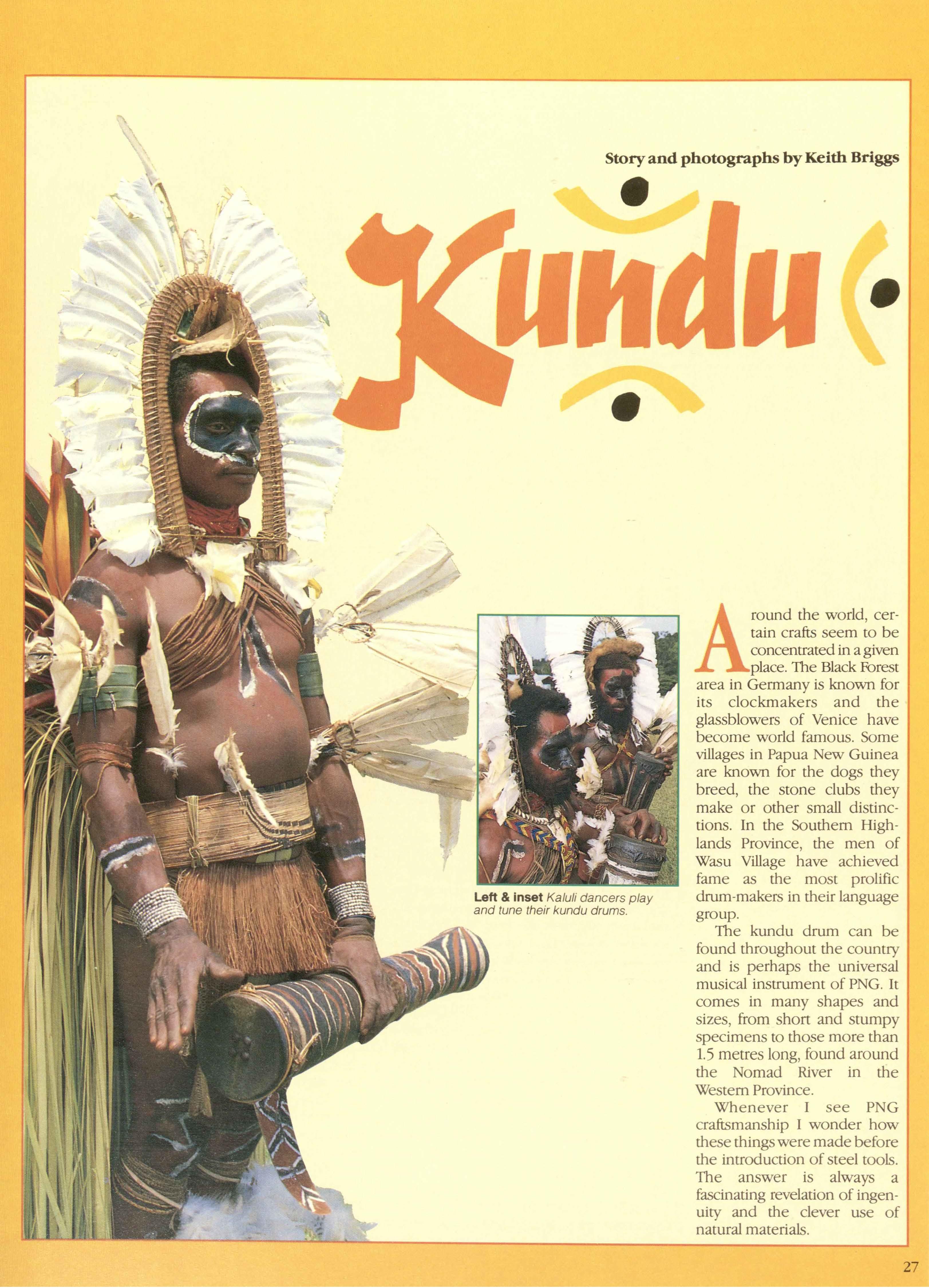 The kundu drum can be found throughout the country and is perhaps the universal musical instrument of PNG. It comes in many shapes and sizes, from short and stumpy specimens to those more than 1.5metres long, found around the Nomad River in the Western Province.