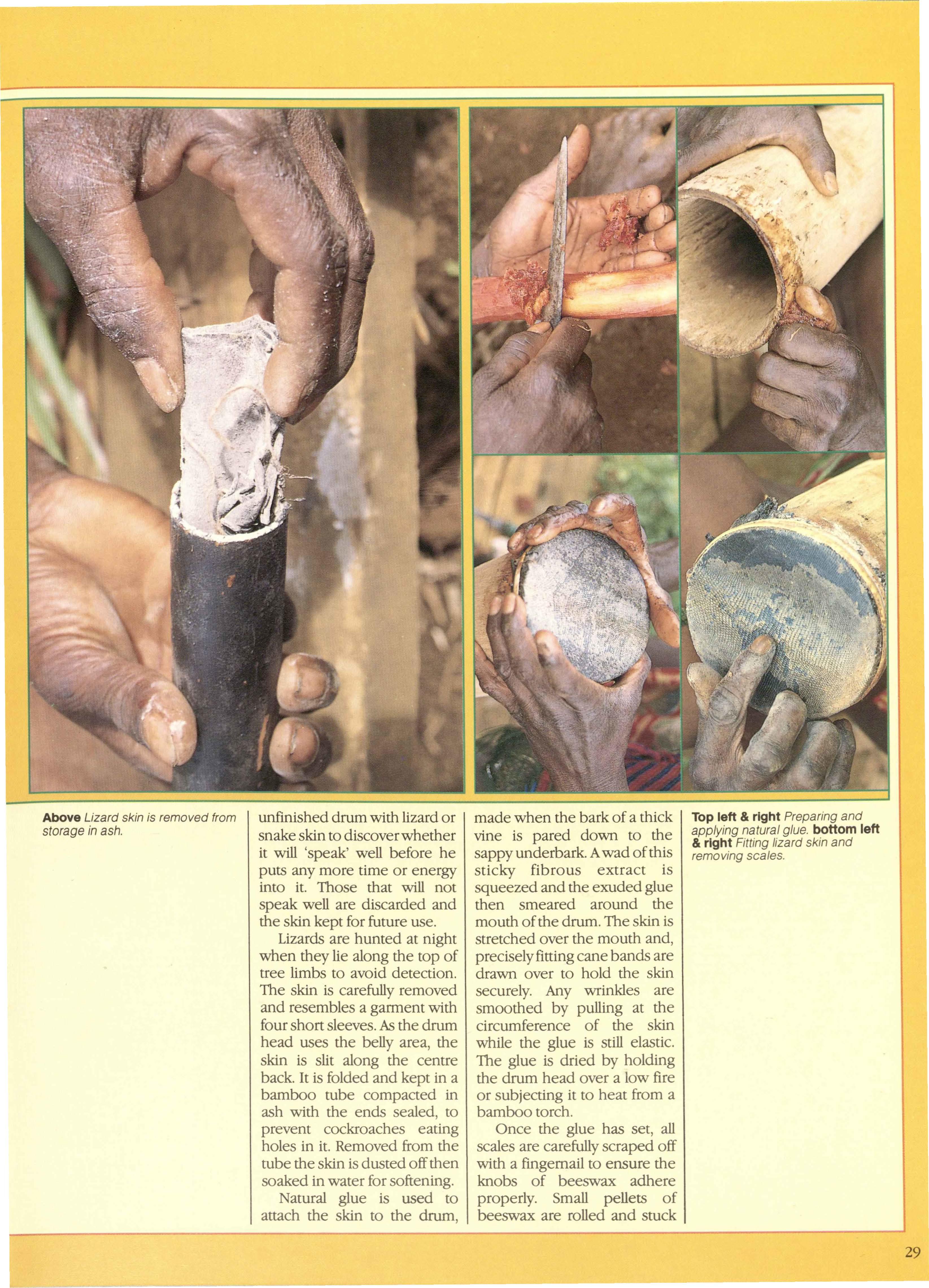 made when the bark of a thick vine is pared down to the sappy underbark. A wad of this sticky fibrous extract is squeezed and the exuded glue then smeared around the mouth of the drum. The skin is stretched over the mouth and, precisely fitting cane bands are drawn over to hold the skin securely. Any wrinkles are smoothed by pulling at the circumference of the skin while the glue is still elastic. The glue is dried by holding the drum head over a low fire or subjecting it to heat from a bamboo torch.