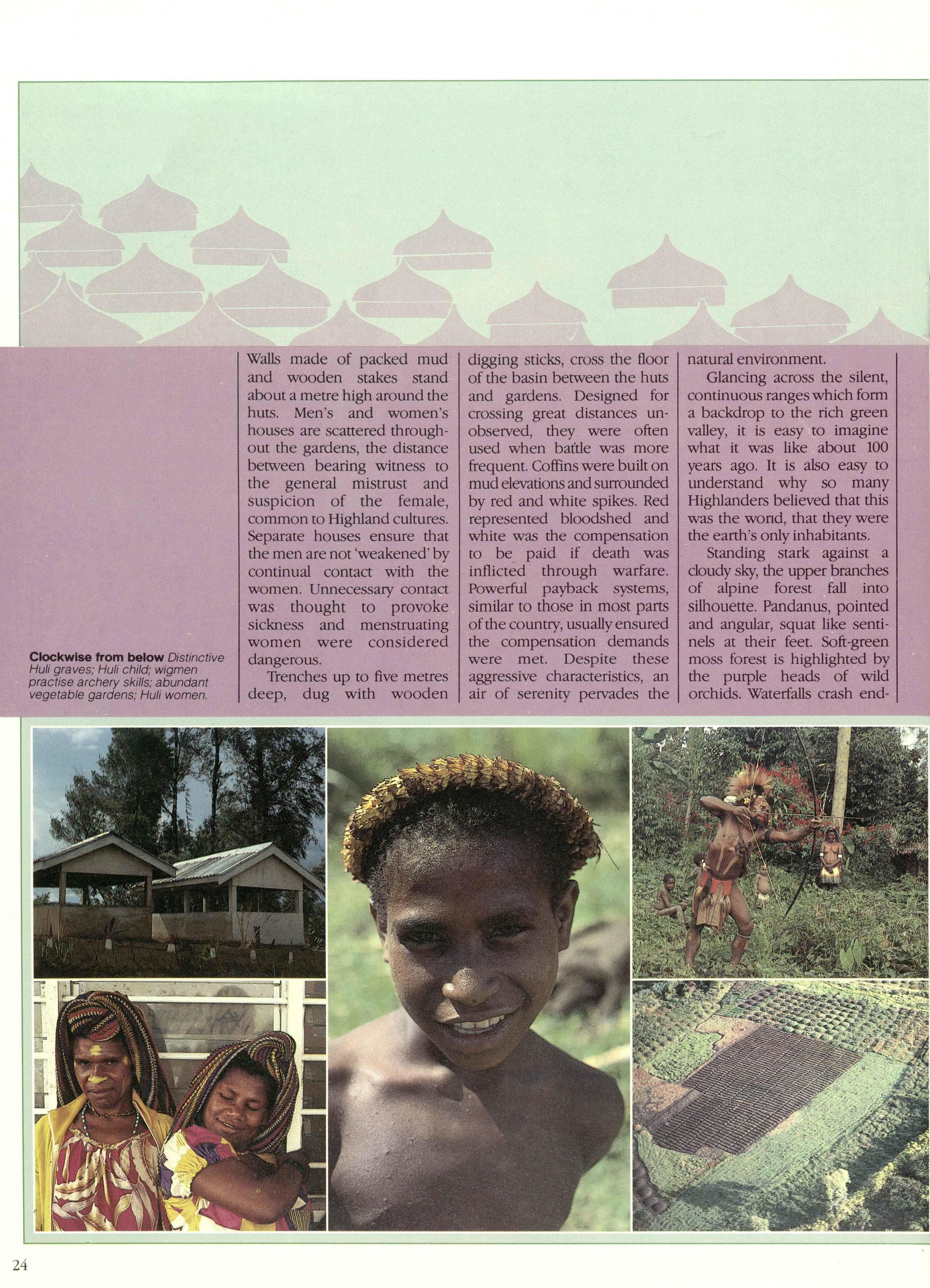 Clockwise from below Waterfall at Ambua Lodge; well tended vegetable plots; mor_ningcooking fire smoke blends with the mist; makeup and nose decoration is normal day wear for Huli men.