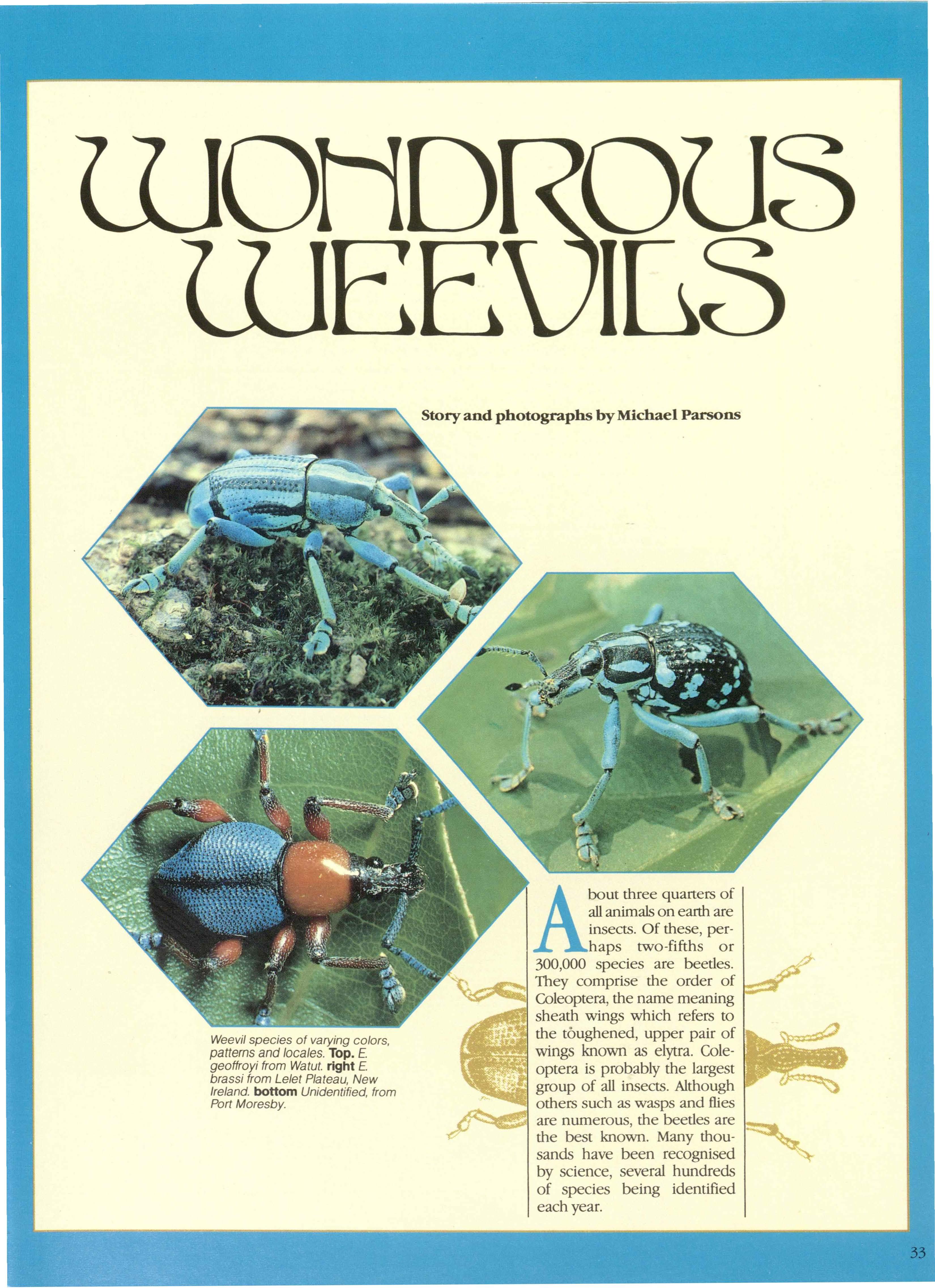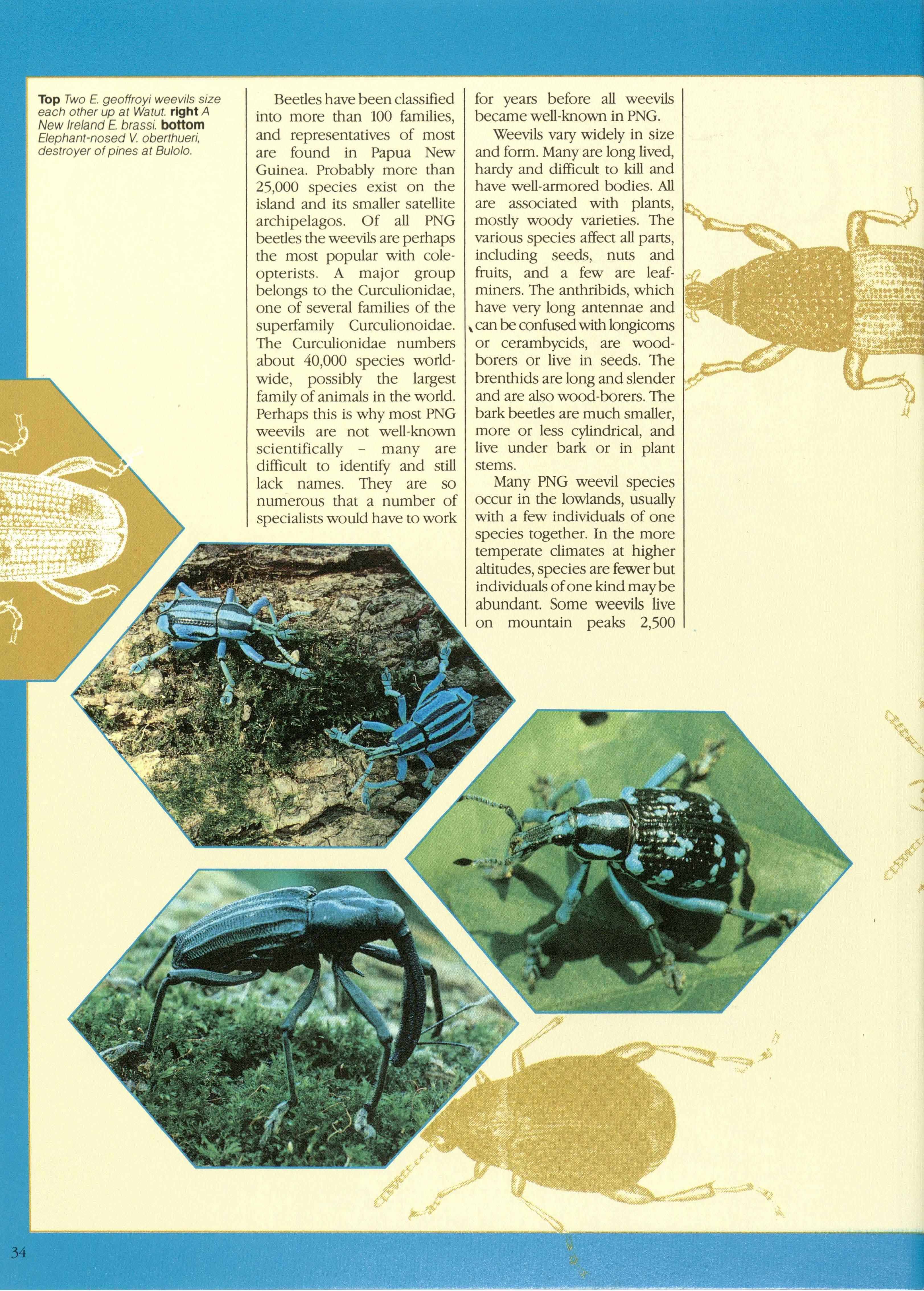 Weevil species of varying co/ors, patternsand locales.Top. E geoffroyi from Watut. right E. brassi from Le/et Plateau, New Ireland. bottom Unidentified, from Port Moresby.