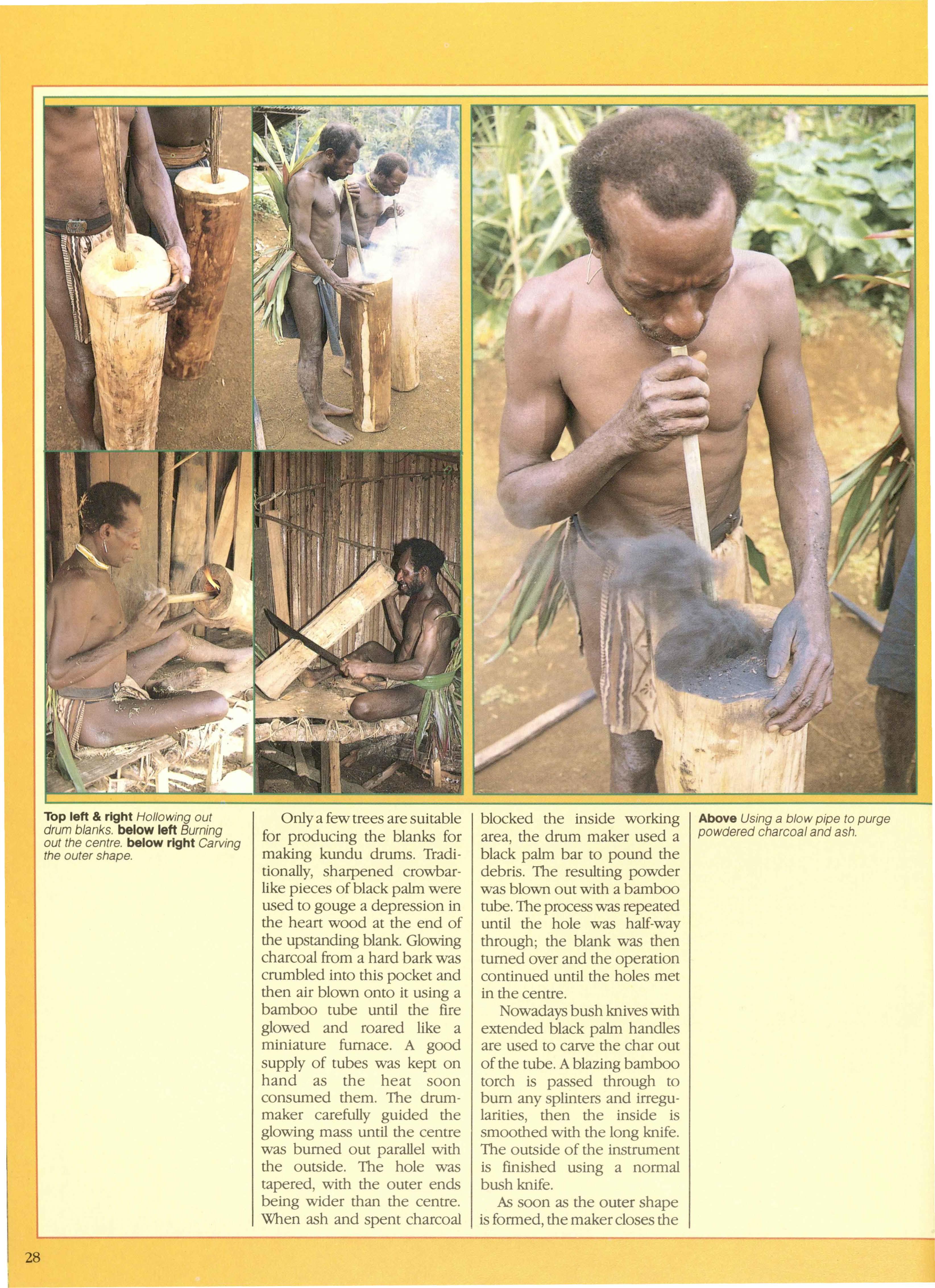 Only a few trees are suitable for producing the blanks for making kundu drums. Traditionally, sharpened crowbarlike pieces of black palm were used to gouge a depression in the heart wood at the end of the upstanding blank Glowing charcoal from a hard bark was crumbled into this pocket and then air blown onto it using a bamboo tube until the fire glowed and roared like a miniature furnace. A good supply of tubes was kept on hand as the heat soon consumed them. The drummaker carefully guided the glowing mass until the centre was burned out parallel with the outside. The hole was tapered, with the outer ends being wider than the centre. When ash and spent charcoal