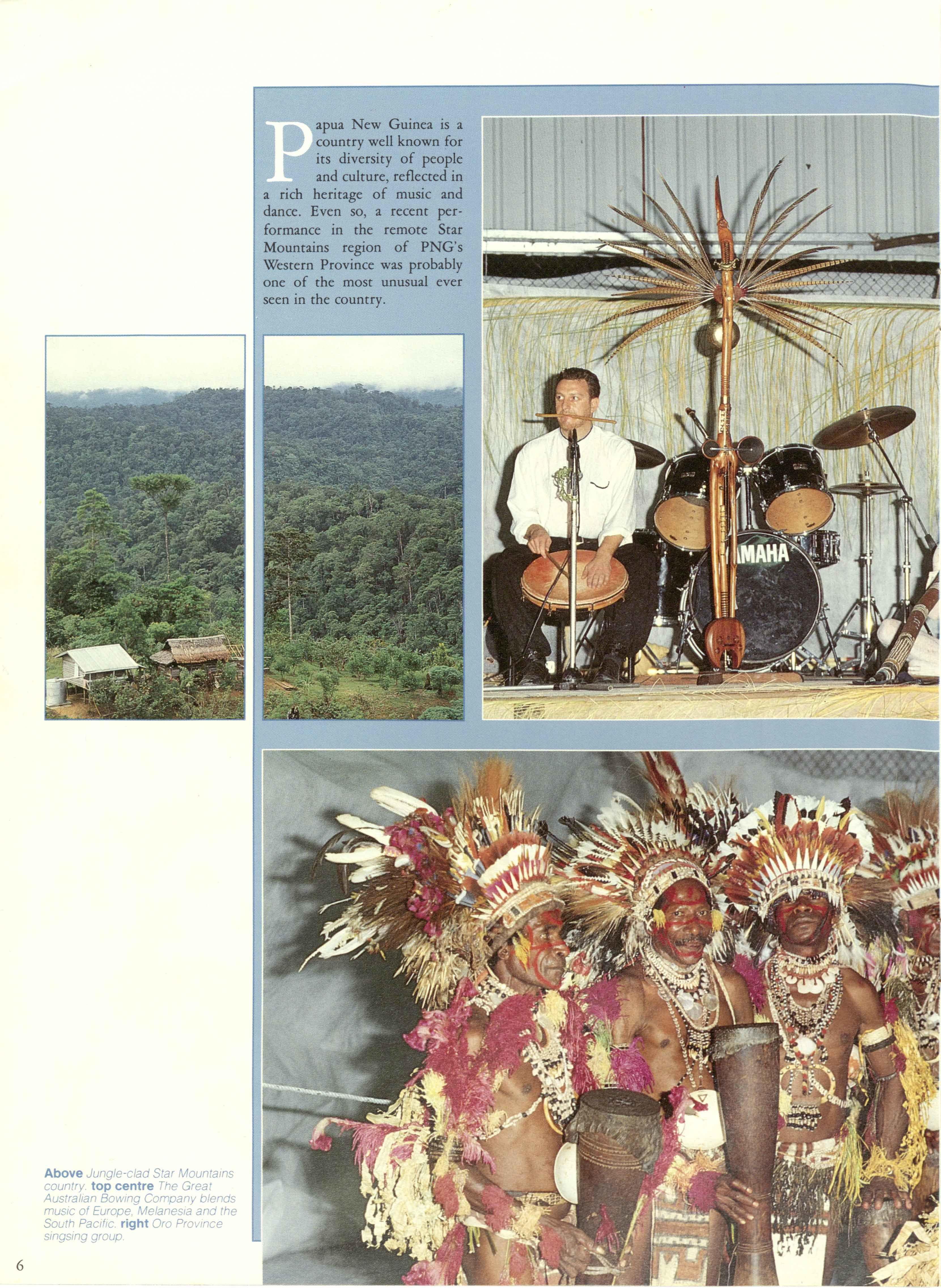Above Jungle-clad Star Mountains country. top centre The Great Australian Bowing Company blends music of Europe Melanesia and the South Pacific right Oro Province singsing group
