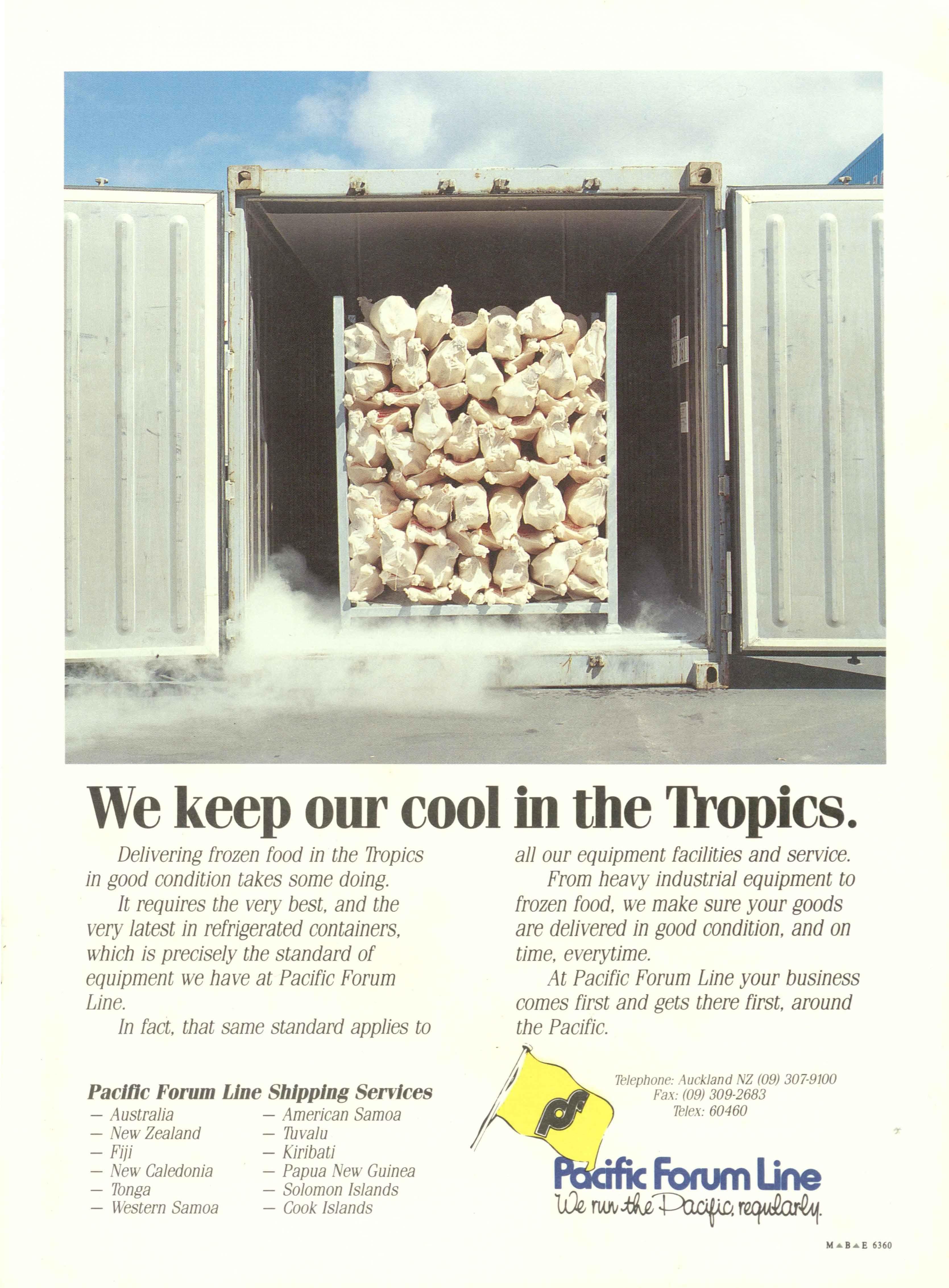 Denverjngfrozenfood jn the Tropjcs jn good condjUontakes somedojng. It requjres the very best, and the very latest jn refrjgeratedcontajners, whjchjs precjselythe standard of equjpmentwe have at PacjficForum £jne.