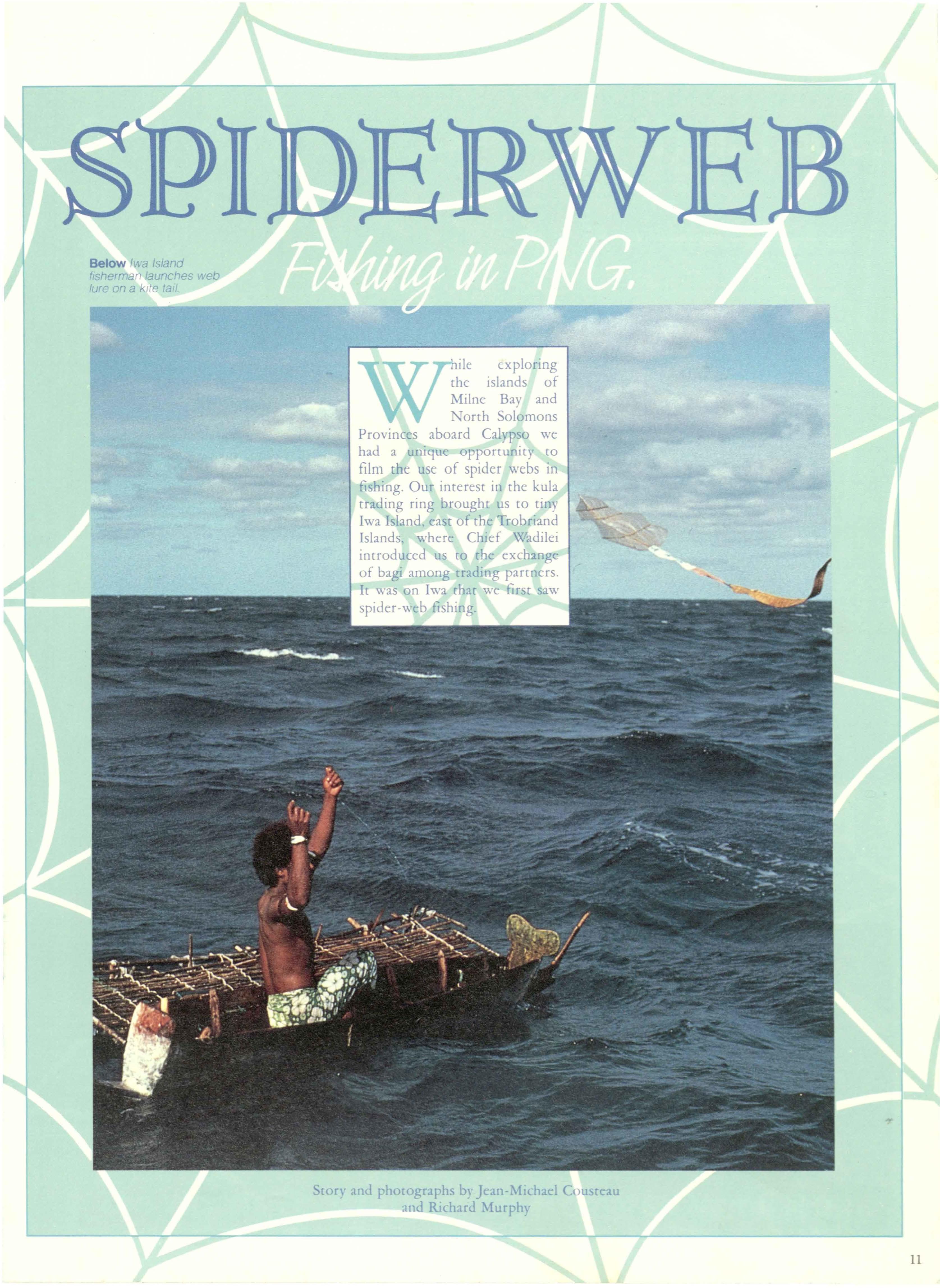 ile exploring the islands of Milne Bay and North Solomons Provinces aboard Calypso we had a unique opportunity to film the use of spider webs in fishing. Our interest in the kula trading ring brought us to tiny Iwa Island. ease of the Trobriand Islands, where Chief 1adilei introduced us co the exchange of bagi among trading partners. It was on Iwa tliat we fu t saw spider-web fishing.
