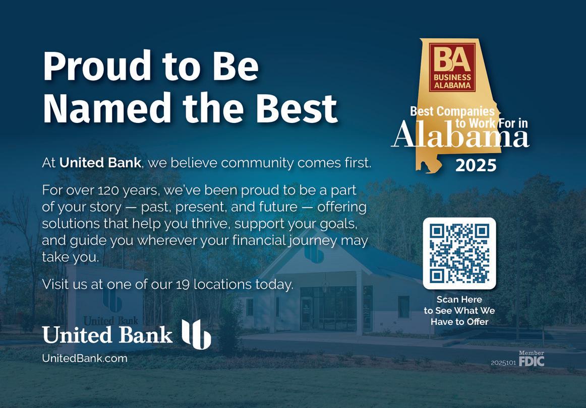 Business Alabama is published monthly by PMT Publishing Co., Inc. Copyright 2025 by PMT Publishing Co., Inc. All rights reserved. Reproduction in whole or in part without written permission prohibited.