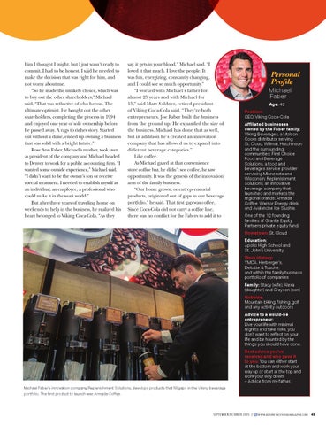 him I thought I might, but I just wasn’t ready to commit. I had to be honest. I said he needed to make the decision that was right for him, and not worry about me. “So he made the unlikely choice, which was to buy out the other shareholders,” Michael said. “That was reflective of who he was. The ultimate optimist. He bought out the other shareholders, completing the process in 1994 and enjoyed one year of sole ownership before he passed away. A rags to riches story. Started out without a dime, ended up owning a business that was solid with a bright future.” Rose Ann Faber, Michael’s mother, took over as president of the company and Michael headed to Denver to work for a public accounting firm. “I wanted some outside experience,” Michael said. “I didn’t want to be the owner’s son or receive special treatment. I needed to establish myself as an individual, an employee, a professional who could make it in the work world.” But after three years of traveling home on weekends to help in the business, he realized his heart belonged to Viking Coca-Cola. “As they