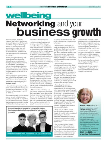 - Prepare a short introduction about what you have to offer. Some networking groups offer a 60 second round where everyone is given the opportunity to say a little about - Treat networking as an opportunity to themselves. Resist the temptation to make connections, build relationships, say everything you can about your circulate and get known as the go-to business. Focus on one aspect which guy in your field. Working as a sole will whet people’s appetite for more trader or in a small business can be or deliver an interesting fact or tip lonely, so getting out there, meeting each time you attend. Try to end with people, building relationships can be a memorable tag line or slogan. valuable on many levels. Friendships can be made, complementary alliances - As you begin to feel more comfortable with your network formed, help shared. meetings it can be tempting to stay - A basic tenet of networking is to within your regular group, the people get to know, like and trust the people you’re familiar with. It can seem easier you meet. Few of us are likely to refer to treat it as a social event, rather business to someone we hardly know. than mingle with people you don’t Our inner circle of friends, family and know. Someone told me about a rule contacts are precious and we need to they had which ensured they talked feel sure that they will be in safe hands. to 3 new people at every meeting they attended. That way they used Once you have confidence in the each meeting well, made new people you’ve met be generous contacts and were able to develop the potential for leads. - Keep in touch with the people you’ve met through networking, maybe via email or with an occasional interesting and informative newsletter. Remember to follow-up on something you’ve been told or arrange to catch-up over coffee from time to time.