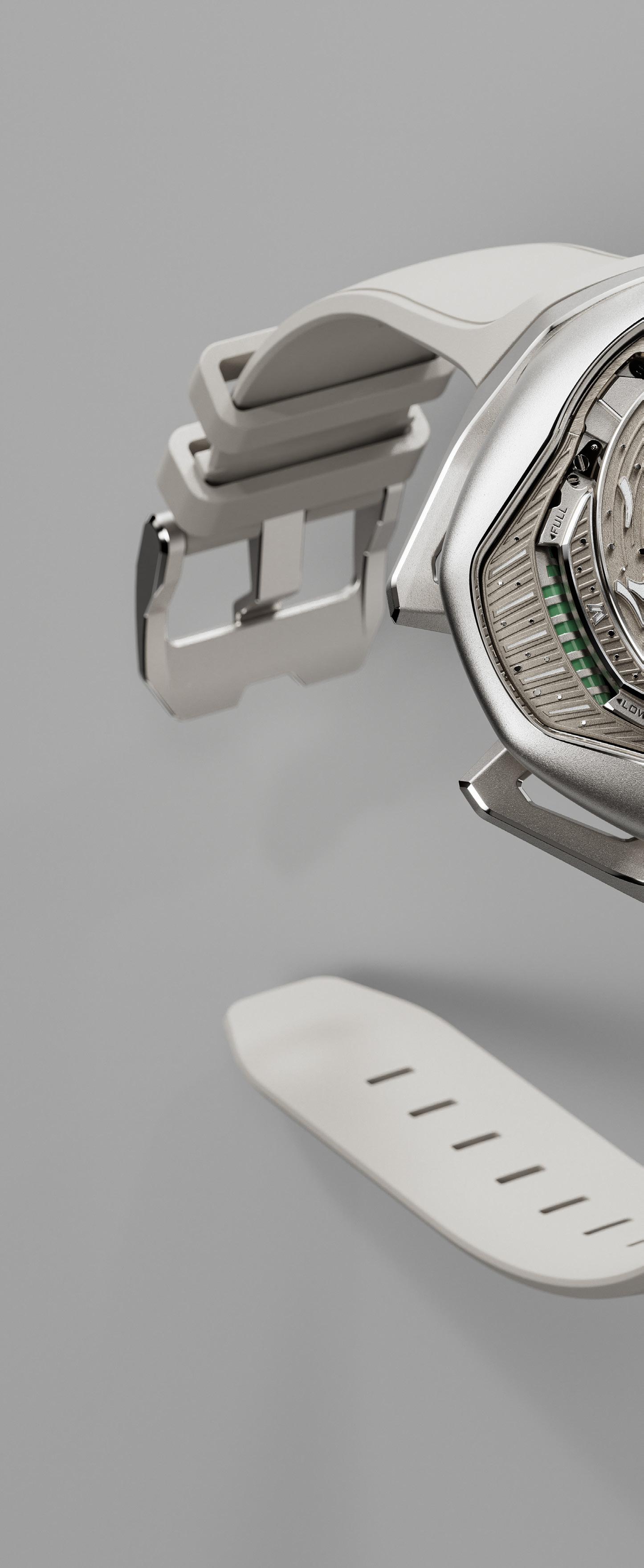 At just 10.5mm thick, including the crystal, the Orb maximises its internal volume with theatrical depth. Superluminovacoated hands and hour markers are framed by the PVD-coated titanium inner bezel, while the flying tourbillon at six o’clock balances the winding barrel at twelve. The result is a watch that is not only an object of precision but also an aesthetic sculpture, an invitation to engage.