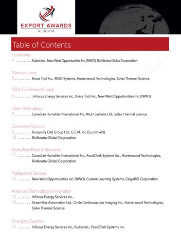 Table of Contents Leadership 4 . . . . . . . . . . . . Kudos Inc., New West Opportunities Inc. (NWO), BioNeutra Global Corporation Manufacturing 5 . . . . . . . . . . . Brace Tool Inc., MGO Systems, Hunterwood Technologies, Solex Thermal Science Oil & Gas Service/Supply 6 . . . . . . . . . . . .InFocus Energy Services Inc., Brace Tool Inc., New West Opportunities Inc. (NWO) Clean Technology 7 . . . . . . . . . . . Canadian Humalite International Inc, MGO Systems Ltd., Solex Thermal Science Consumer Products 8 . . . . . . . . . . . Burgundy Oak Group Ltd., G.E.M. Inc. (Euroshield) 10 . . . . . . . . . BioNeutra Global Corporation Agriculture Food & Beverage 11 . . . . . . . . . Canadian Humalite International Inc., FoodChek Systems Inc., Hunterwood Technologies, . . . . . . . . . . . . BioNeutra Global Corporation