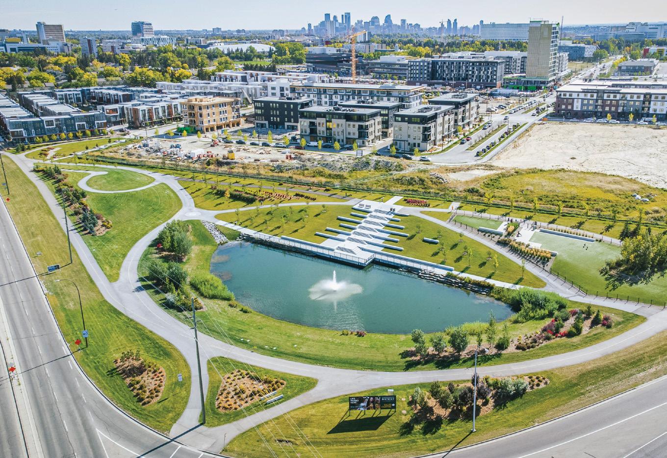 “With three parks completed, there are a variety of options to explore on foot. Northwest Commons Park is a 1.5acre park with large open spaces but most importantly it is a Playcore National Demonstration Site recognizing its inclusive and accessible design for diverse mobility needs,” says Henderson. “We also have the North Pond on the corner of 32 Avenue and Shaganappi Trail which is more of a contemplative area but centred around an urban dog park. Most recently, we opened Central Commons Park, which is a three-acre all-seasons oasis with everything from fire features and BBQs to picnic tables and shade structures, and of course the seasonal ice rink and splash pad.”