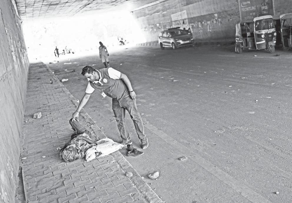 Some approached by Semar and his partner, Avanish Kumar, refuse to go with them. Others appear drunk or drugged and are disqualified from being taken to one of SHEOWS’ shelters. As an orange sun descends in a hazy sky, they pick up a man named Atmaram whose jeans and shirt are worn and dirty and who drags a sack with a blanket and his other belongings. Inside the ambulance, flashes of red and blue strobes ricochet and the siren buffets a nearby mosque’s blaring call to prayer.