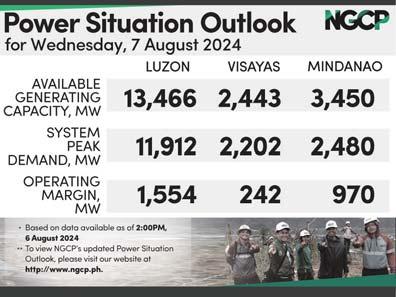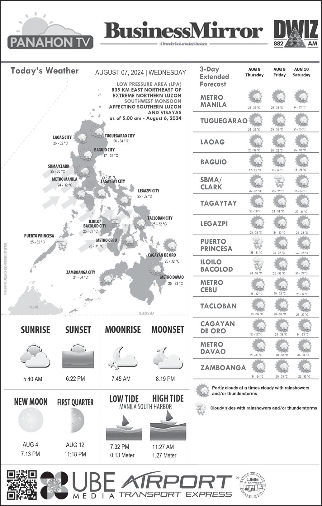 The PSA will release the second quarter National Income Accounts (NIA) on Thursday. Some analysts expect GDP growth will be higher than 6 percent due to base effects as the economy grew by only 4.3 percent last year. (See: https://businessmirror.com.ph/2024/08/06/q2-growth-at6-3-possible-projects-moodys-analytics/)