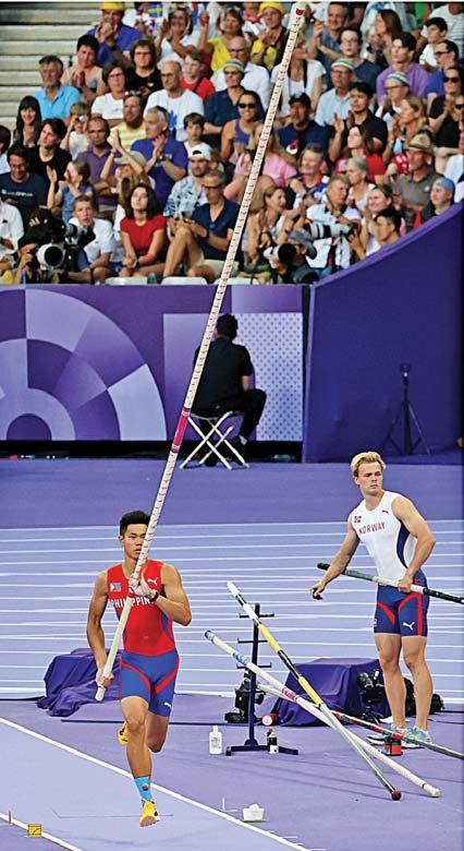 PARIS—Ernest John “EJ” Obiena wound up just outside the podium of men’s pole vault at the Stade de Paris on Monday night—a marked improvement from his 11thplace finish in his Olympic debut in Tokyo 2020 three years ago.