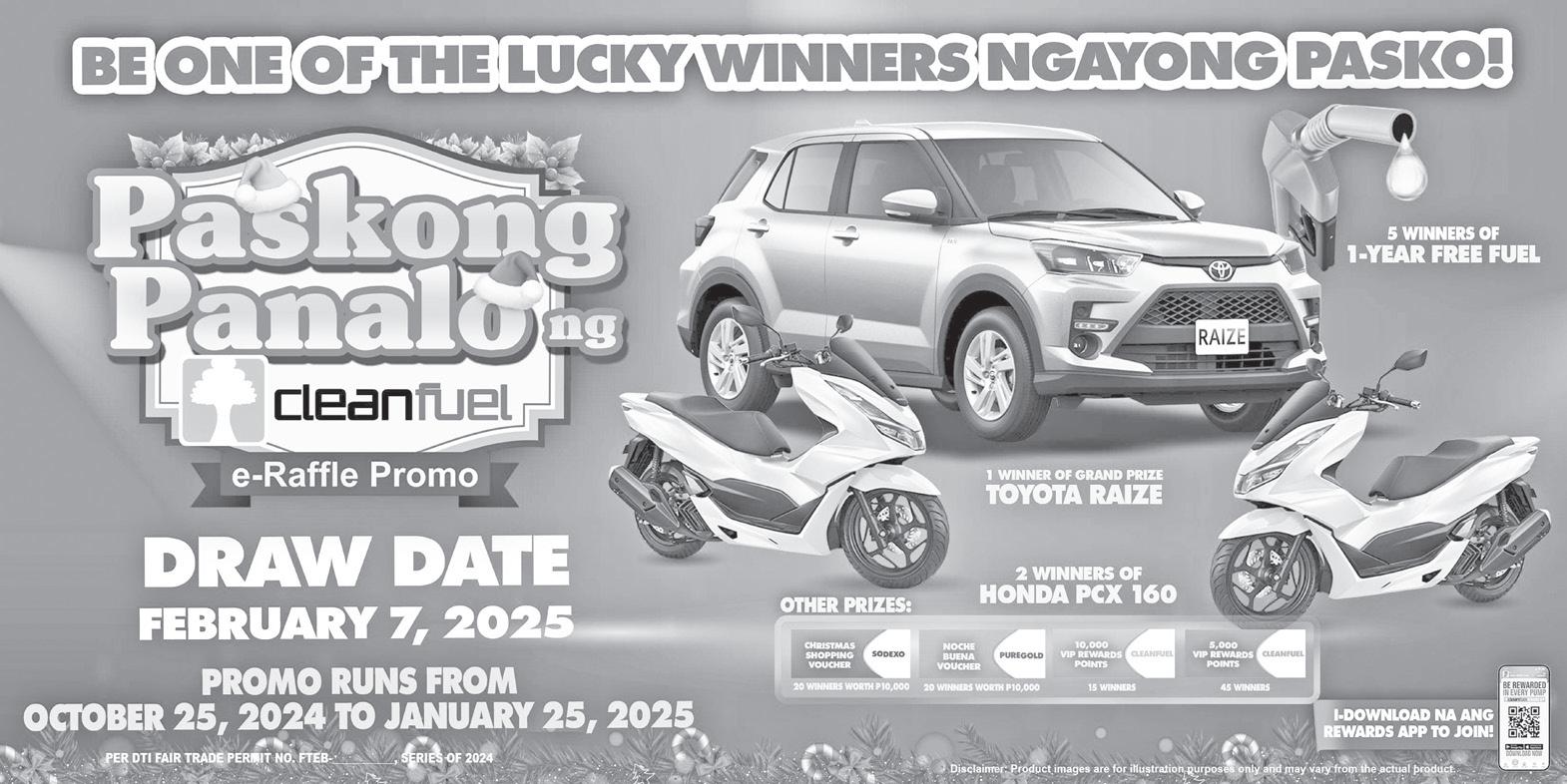 THIS Holiday season, Cleanfuel is bringing back its annual Christmas promotion, “Paskong Panalo ng Cleanfuel” Raffle promo, with its commitment to give back bigger and better prizes to its loyal patrons, including a brand-new Toyota Raize, two Honda PCX 160 scooters, five winners of OneYear FREE Fuel, 40 Noche Buena packages (Sodexo and Puregold), and many more!