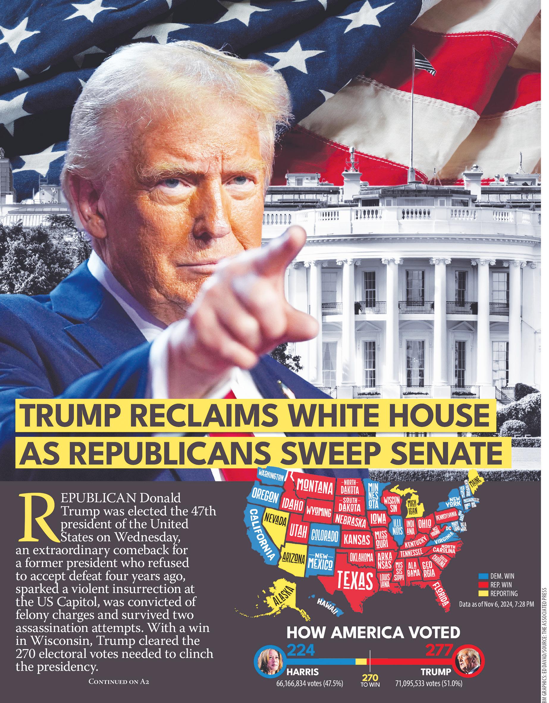 “CONGRATULATIONS on history’s greatest comeback!” wrote Israeli Prime Minister Benjamin Netanyahu on X. “Your historic return to the White House o ers a new beginning for