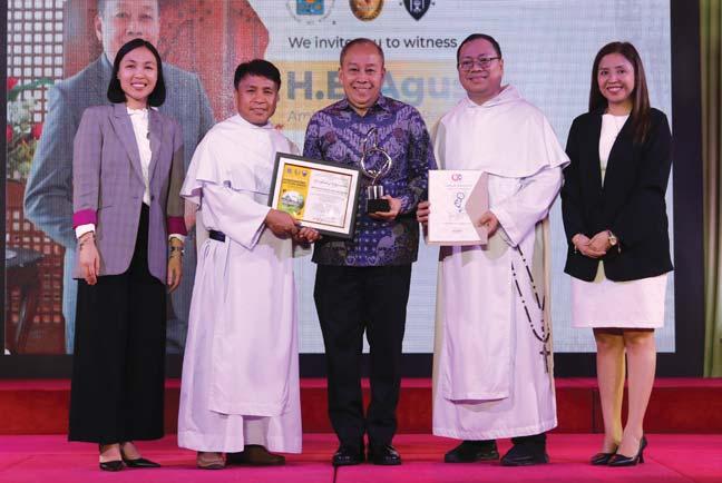 AMBASSADOR Agus Widjojo (center) carries the lecture token and poses with UST director Michaella Lagniton (from left); regent Rev. Fr. George Phe Mang OP; secretary-general Rev. Fr. Louie Coronel OP, EHL; and dean Prof. Melanie Turingan PhD