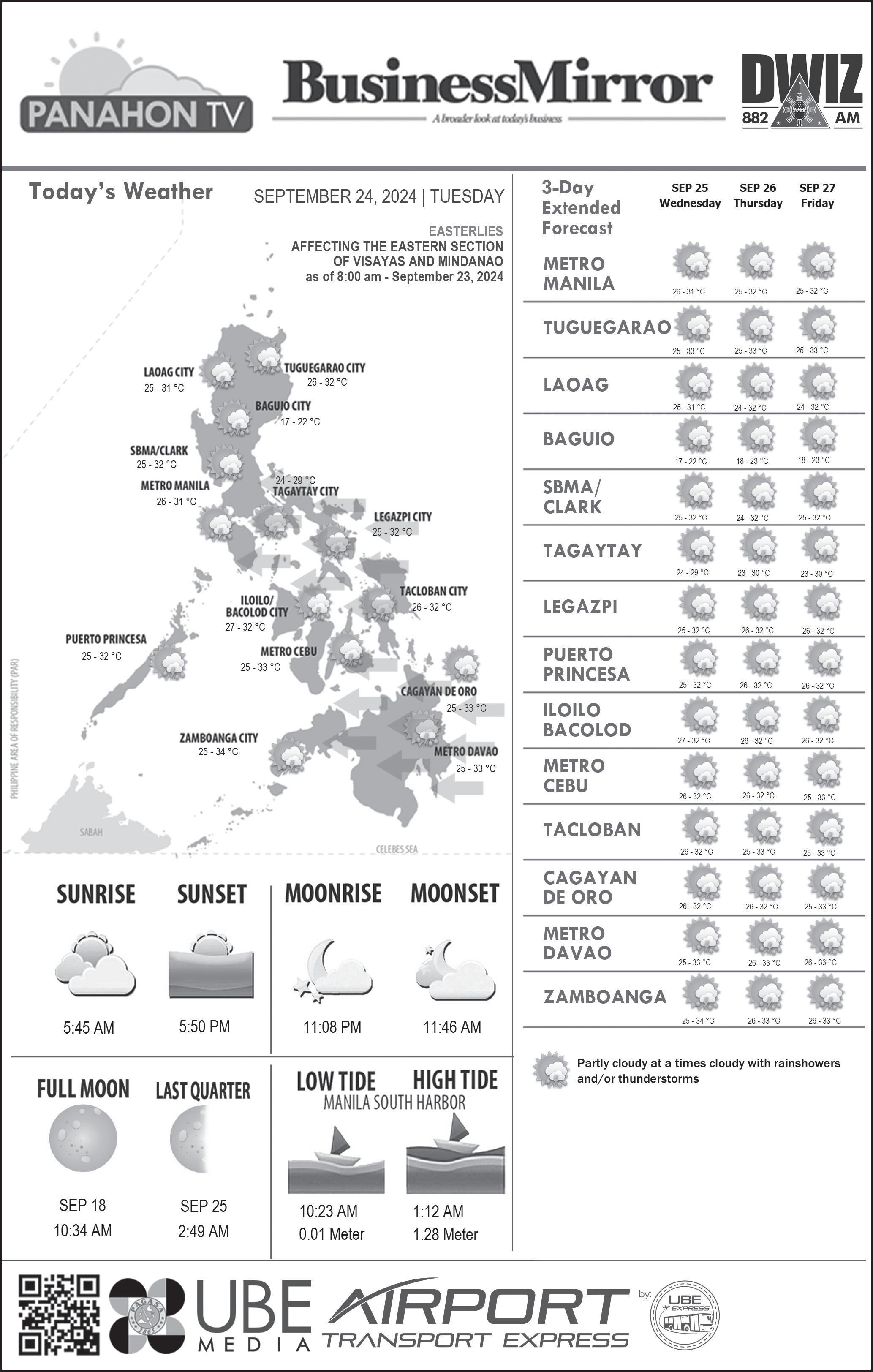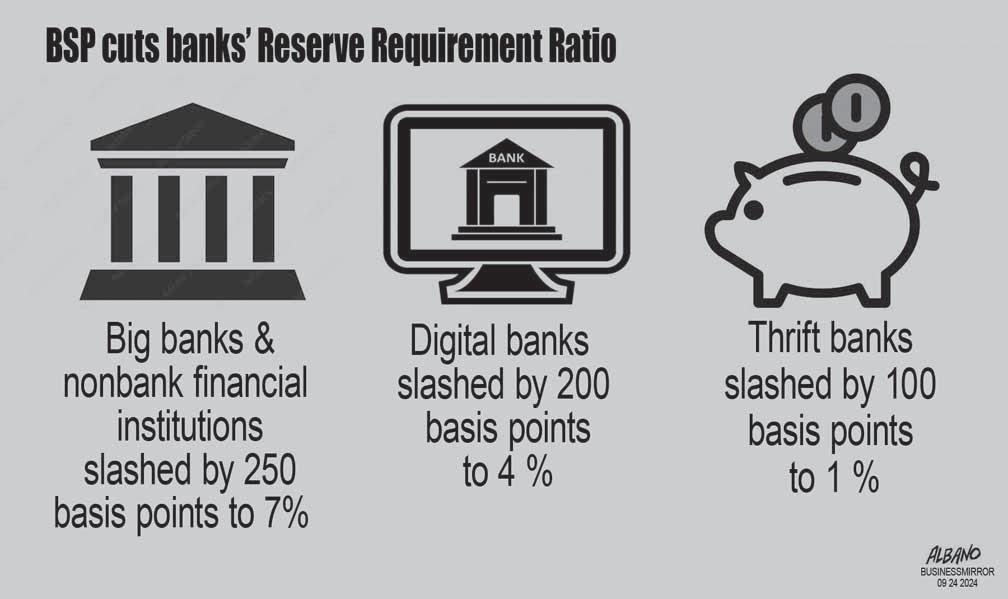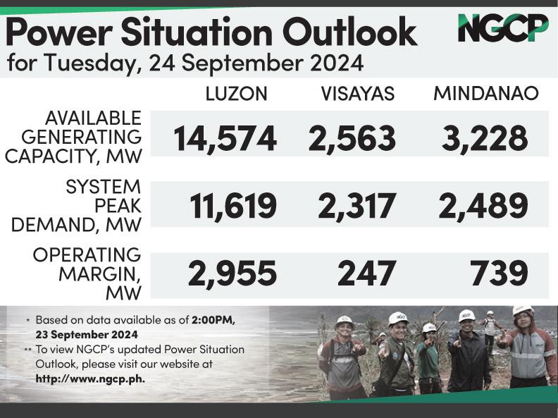 Sentral ng Pilipinas (BSP) said external forecasters now expect inflation to ease to 3.5 percent as of August 2024, slower than the 3.7 percent estimated in May 2024. According to the MPR, forecasts also decreased to 3.1 percent from 3.5 percent for 2025, and 3.2 percent from 3.4 percent for 2026. (See: https:// businessmirror.com.ph/2024/09/09/ forecasters-in-bsp-poll-inflationtrending-down-till-26/).