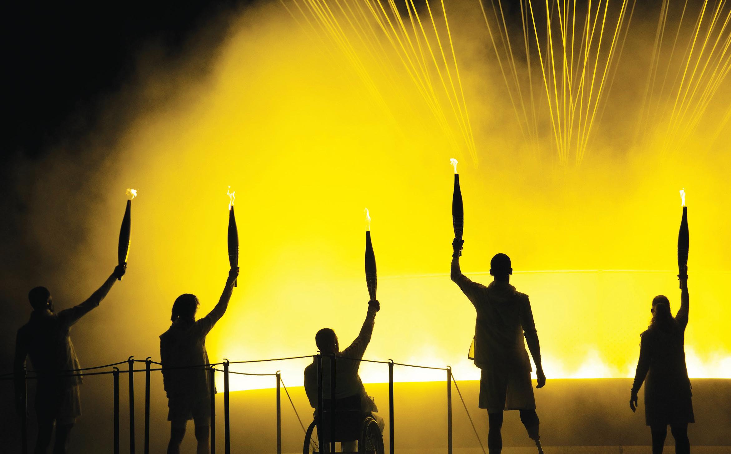 As the ceremony concluded, the Paralympic torch was carried into the area by former Olympic wheelchair tennis gold medalist Michaël Jérémiasz, who was surrounded on stage by dozens of torchbearers. Five French Paralympians lit the Olympic cauldron, which is designed to look like a