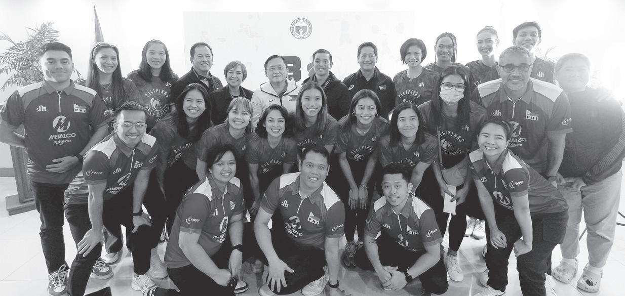 SENATOR Christopher Lawrence “Bong” Go (white track suit) with the Alas Pilipinas women players and coaching staff. ROY DOMINGO