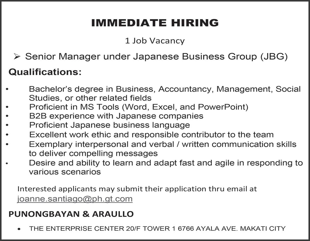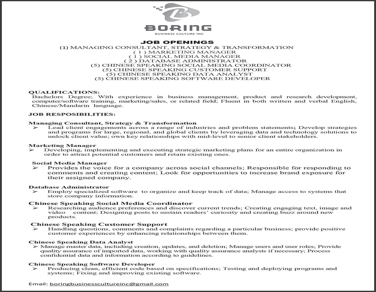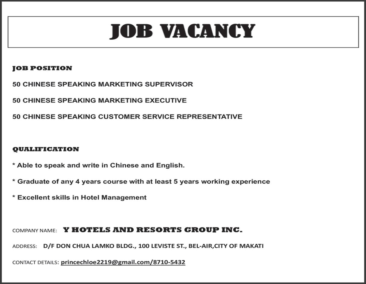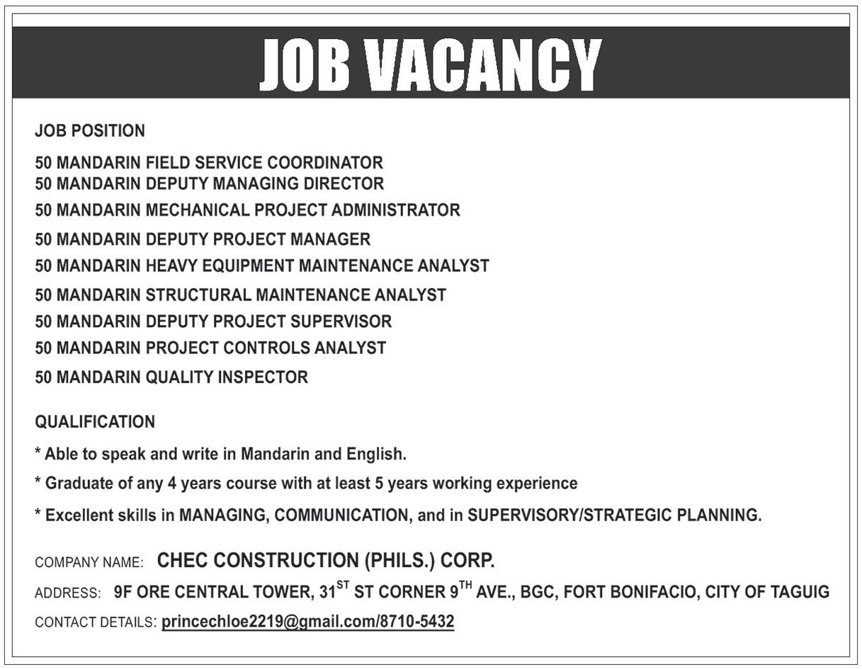 Basic Qualification: Proficient in speaking, reading and writing in Mandarin language. Salary Range: Php 60,000 - Php 89,999