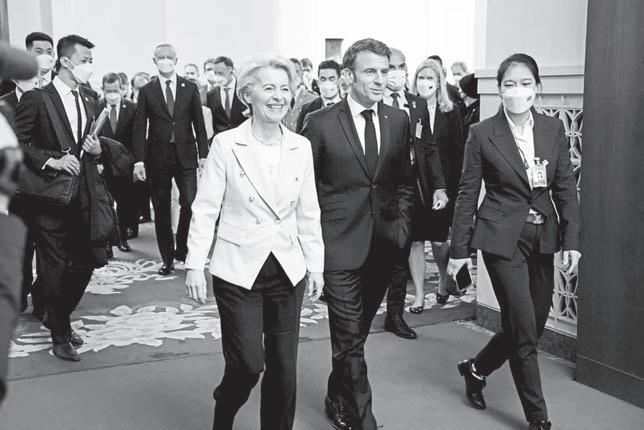 FRENCH President Emmanuel Macron and European Commission President Ursula von de Leyen, center left, arrive for a working session with Chinese President Xi Jinping in Beijing on April 6, 2023. In the weeks since Chinese leader Xi Jinping won a third five-year term as president, setting him on course to remain in power for life, leaders and diplomats from around the world have beaten a path to his door. None more so than those from Europe. LUDOVIC MARIN/POOL VIA AP