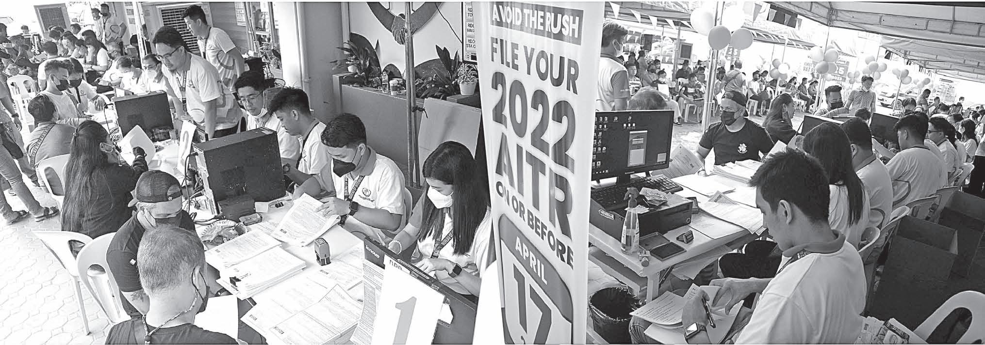2006 National Newspaper of the Year 2011 National Newspaper of the Year 2013 Business Newspaper of the Year 2017 Business Newspaper of the Year 2019 Business Newspaper of the Year 2021 Pro Patria Award PHILIPPINE STATISTICS AUTHORITY 2018 Data Champion EJAP JOURNALISM AWARDS BUSINESS NEWS SOURCE OF THE YEAR (2017, 2018, 2019, 2020, 2021) DEPARTMENT OF SCIENCE AND TECHNOLOGY 2018 BANTOG MEDIA AWARDS n Tuesday, April 18, 2023 Vol. 18 No. 183 TAX DEADLINE Taxpayers file their income tax returns on the last day of filing at the Bureau of Internal Revenue office in Intramuros, Manila, on Monday, April 17, 2023. The bureau said there would be no extension for the payment deadline. The lines were noticeably thinner, though, as a result of BIR’s “pay anywhere, file anywhere” policy, which allowed taxpayers to file their tax returns even in BIR offices outside of where their businesses were registered. ROY DOMINGO PESO EXCHANGE RATES n US 55.1530 n JAPAN 0.4122 n UK 68.5221 n HK 7.0269 n CHINA 8.0293 n SINGAPORE 41.4778 n AUSTRALIA 36.9635 n EU 60.6462 n KOREA 0.0423 n SAUDI ARABIA 14.7040 Source: BSP (April 17, 2023) See “P120,000,” A2 EU LEADERS BEAT PATH TO XI’S DOOR SEEKING CHINA’S HELP WORLD FEATURES ›› B7