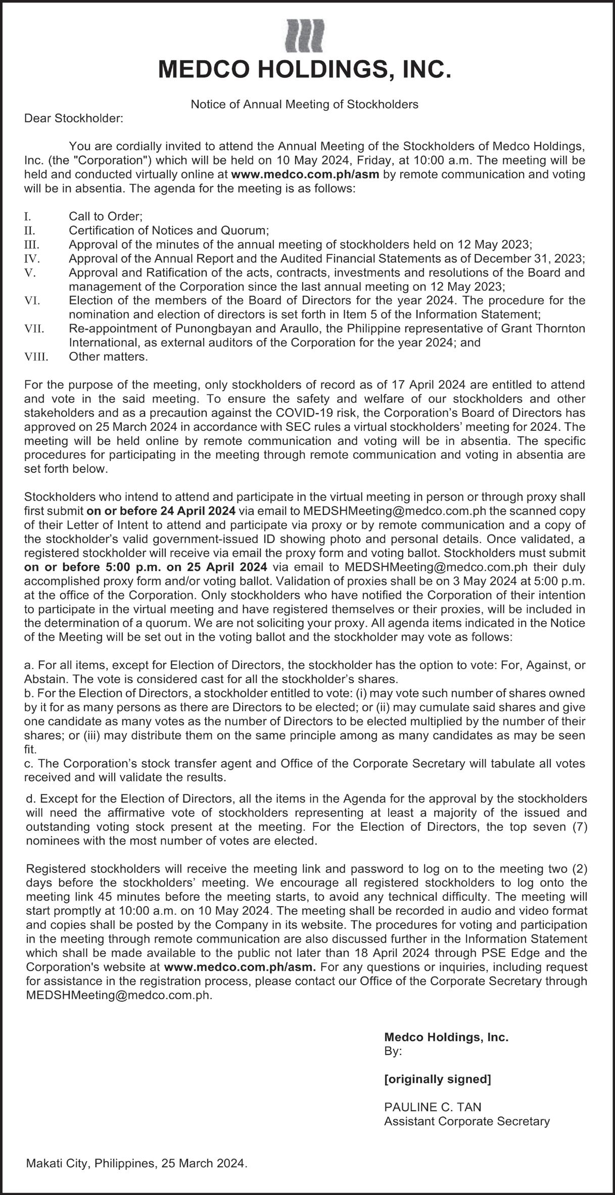 “We’re still in the second quarter. So we have plenty of time. I would say the central scenario will be fourth quarter [we will] ease. If things are worse than we think, that [cutting rates] might be postponed to the fi rst quarter of 2025,” Remolona said.