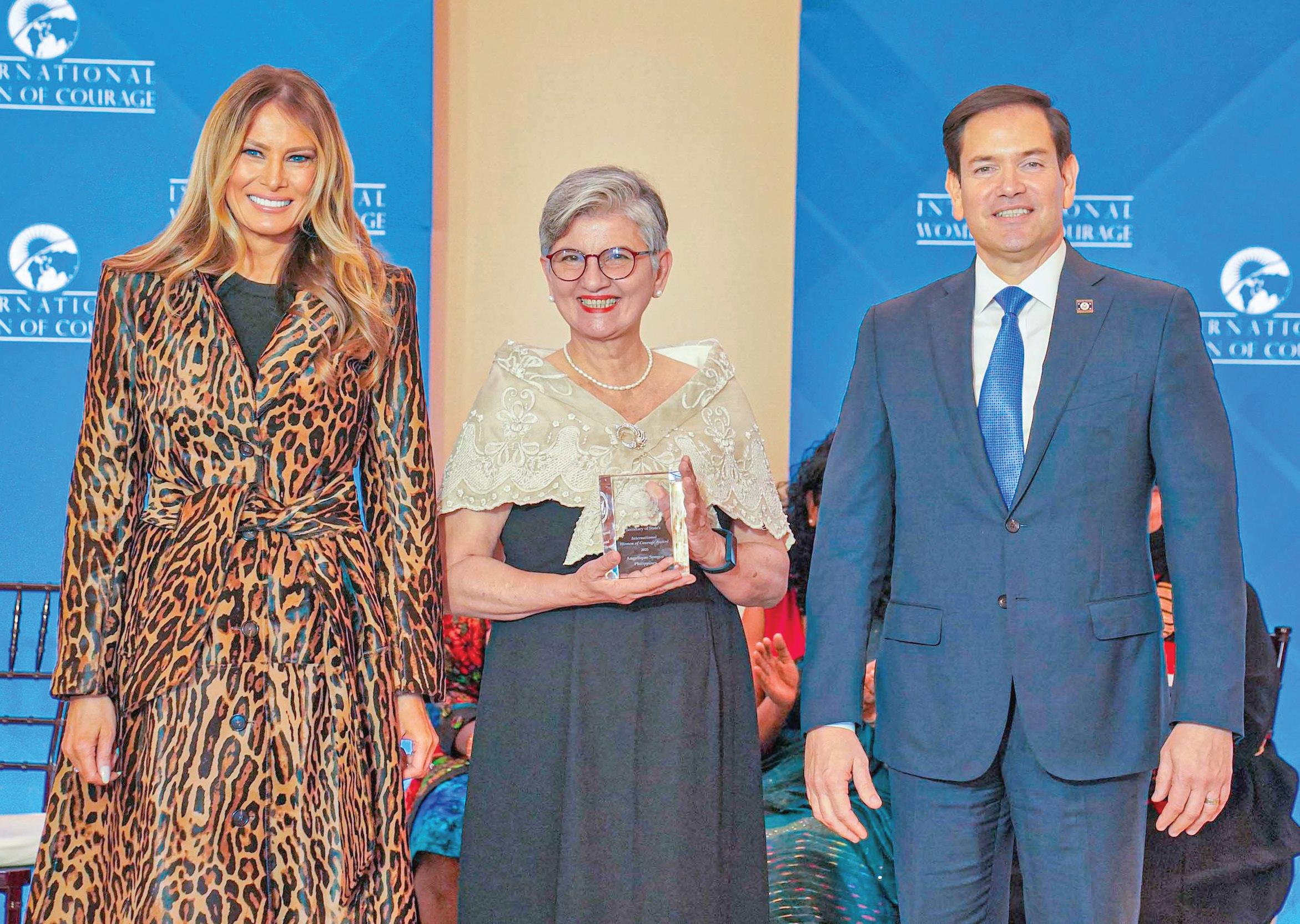 ANGELIQUE “Mama Ranger” Songco of the Philippines, celebrated for her leadership at Tubbataha Reefs Natural Park, is honored by US Secretary of State Marco Rubio and First Lady Melania Trump at the International Women of Courage Award in Washington, D.C., April 1, 2025. Songco has championed