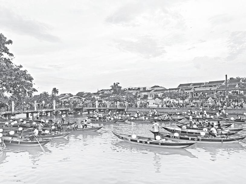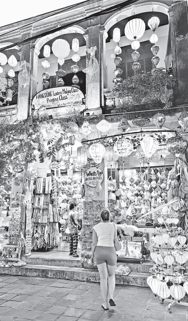 One such residence, the Tan Ky House, bears a stark reminder of the town’s relationship with the nearby Thu Bồn River: a series of markers on its wall indicate the highest floodwaters, some exceeding seven feet. Lanterns, Light, and the Architecture from History WHAT makes strolling through Hoi An’s Old Town after sunset particularly captivating is the explosion of colors from countless lanterns, their varied shapes and designs casting a warm, romantic glow across every street and alley. Lanterns hang from shop façades, while lantern-lit boats drift slowly along the Thu Bồn River, reflecting in its waters. The back-and-forth glow yellow and neon lights highlights the patterns of the Old Town’s heritage architecture, making every building and detail come alive. In such a setting, it is almost impossible to leave, and one that will make you extend your exploration on foot well into the evening.