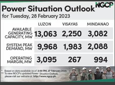 w P25.00 nationwide | 2 sections 28 pages | BusinessMirror 2006 National Newspaper of the Year 2011 National Newspaper of the Year 2013 Business Newspaper of the Year 2017 Business Newspaper of the Year 2019 Business Newspaper of the Year 2021 Pro Patria Award PHILIPPINE STATISTICS AUTHORITY 2018 Data Champion EJAP JOURNALISM AWARDS BUSINESS NEWS SOURCE OF THE YEAR (2017, 2018, 2019, 2020, 2021) DEPARTMENT OF SCIENCE AND TECHNOLOGY 2018 BANTOG MEDIA AWARDS n Tuesday, February 28, 2023 Vol. 18 No. 136 See “BSP,” A2 PESO EXCHANGE RATES n US 55.0140 n JAPAN 0.4034 n UK 65.7912 n HK 7.0099 n CHINA 7.9009 n SINGAPORE 40.7662 n AUSTRALIA 37.0079 n EU 58.0673 n KOREA 0.0419 n SAUDI ARABIA 14.6630 Source BSP (February 27, 2023)