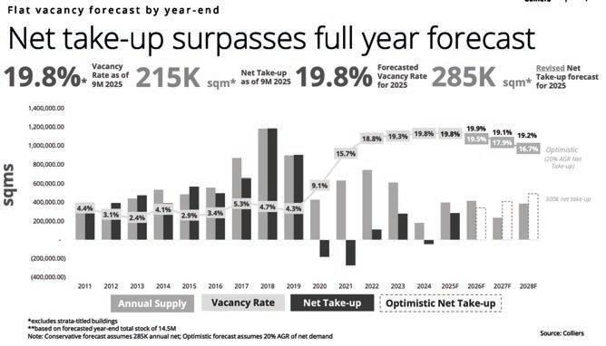WITHIN the first nine months of 2025, the Metro Manila office market surpassed its full year net demand projections, driven by sustained momentum in office transactions and easing of space surrenders post-POGO exit. Vacancy rates eased in the third quarter, supported by notable preleasing activity in newly completed buildings. Demand also picked up in