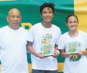 IVAN MANILA (center) and Sandra Bautista (right) pose with Palawan Pawnshop Sports Program Development director Bobby Mangunay after sharing Most Valuable Player honors in the Brookside juniors tilt.