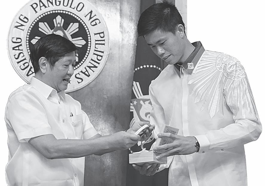 ERNEST JOHN “EJ” OBIENA shows President Ferdinand “Bongbong” Marcos Jr. his world championship bronze medal. MALACAÑANG PHOTO