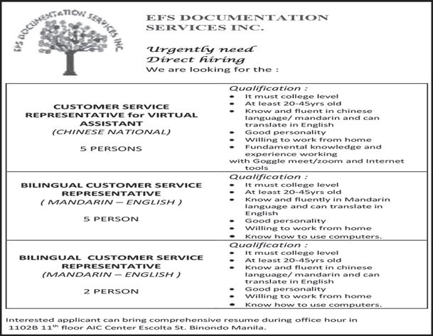 22. LI, XUN Customer Service Representative (Chinese Speaking) Brief Job Description: Provide customer service to clients. Basic Qualification: Any nationality who can speak and write Chinese fluently. Preferably 6 months to 1-year customer service experience. Detail-oriented and has the ability to multitask. Salary Range: Php 30,000 - Php 59,999 23. LIN, WEIFENG Customer Service Representative (Chinese Speaking) Brief Job Description: Provide customer service to clients Basic Qualification: *Any nationality who can speak and write Chinese fluently. *Preferably 6 months to 1-year customer service experience. *Detail-oriented and has the ability to multitask. Salary Range: Php 30,000 - Php 59,999 24. LIU, SHENG-HAO Customer Service Representative (Chinese Speaking) Brief Job Description: Provide customer service to clients Basic Qualification: *Any nationality who can speak and write Chinese fluently. *Preferably 6 months to 1-year customer service experience. *Detail-oriented and has the ability to multitask. Salary Range: Php 30,000 - Php 59,999 25. LONG, MINGRONG Customer Service Representative (Chinese Speaking) Brief Job Description: Provide customer service to clients Basic Qualification: *Any nationality who can speak and write Chinese fluently. *Preferably 6 months to 1-year customer service experience. *Detail-oriented and has the ability to multitask. Salary Range: Php 30,000 - Php 59,999 26. LONG, QIULAN Customer Service Representative (Chinese Speaking) Brief Job Description: Provide customer service to clients Basic Qualification: *Any nationality who can speak and write Chinese fluently. *Preferably 6 months to 1-year customer service experience. *Detail-oriented and has the ability to multitask. Salary Range: Php 30,000 - Php 59,999 27. MA, XIAOLIANG Customer Service Representative (Chinese Speaking) Brief Job Description: Provide customer service to clients Basic Qualification: *Any nationality who can speak and write Chinese fluently. *Preferably 6 months to 1-year customer service experience. *Detail-oriented and has the ability to multitask. Salary Range: Php 30,000 - Php 59,999 28. NG PUI LI Customer Service Representative (Chinese Speaking) Brief Job Description: Provide customer service to clients