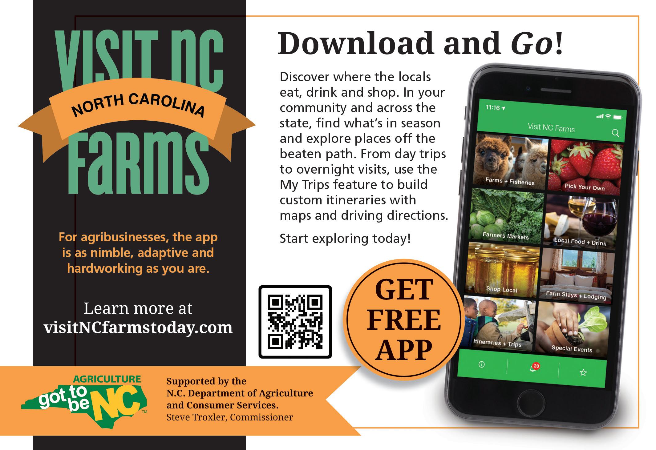 The N.C. Department of Agriculture & Consumer Services launched its Visit NC Farms app in 2018 as a pilot program which has expanded statewide to connect millions of residents and visitors with local farms, food and drink, farmers markets and pick-your-own produce venues and other special agriculture-related places and events.