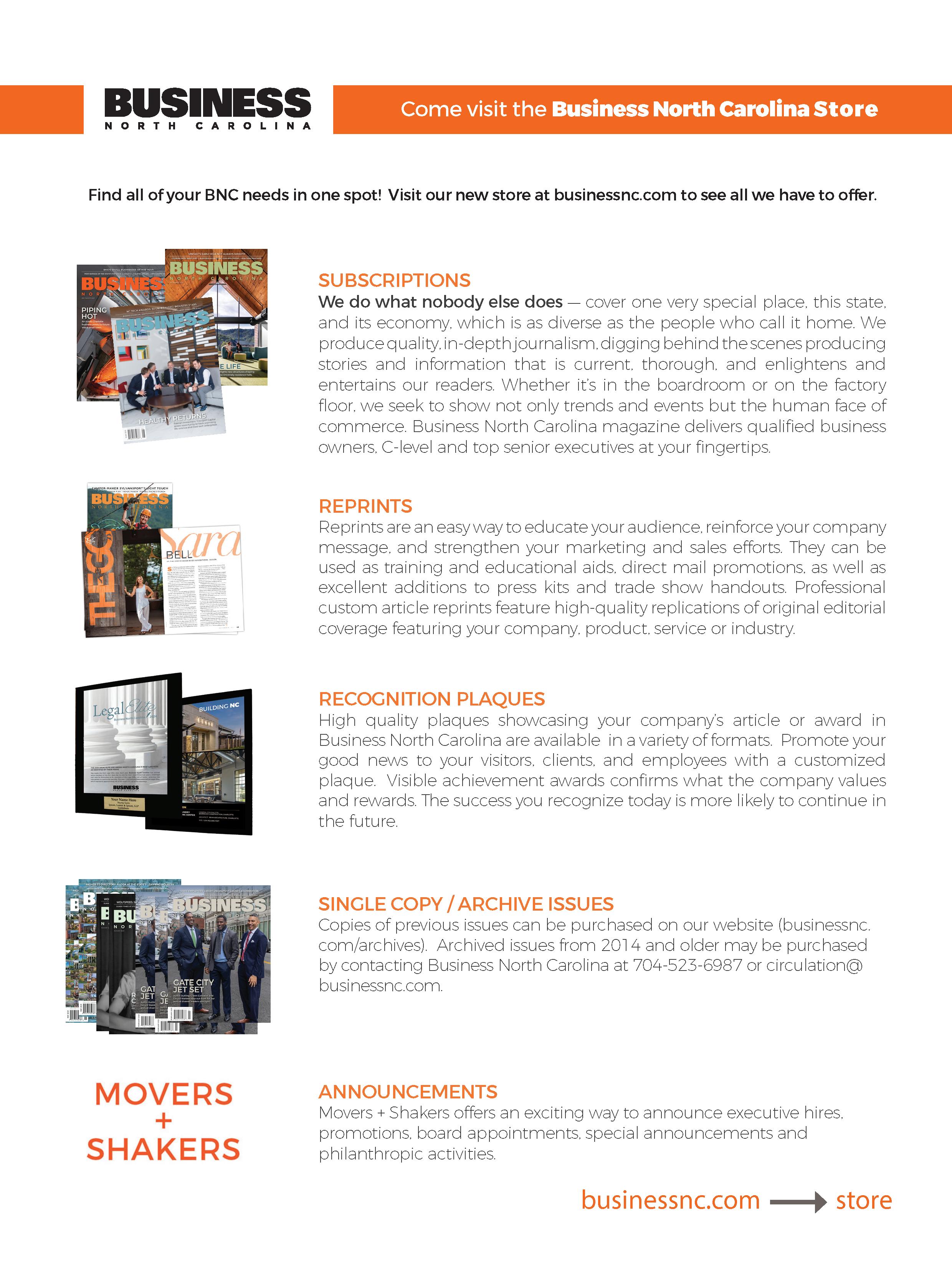 REPRINTS: circulation@businessnc.com
