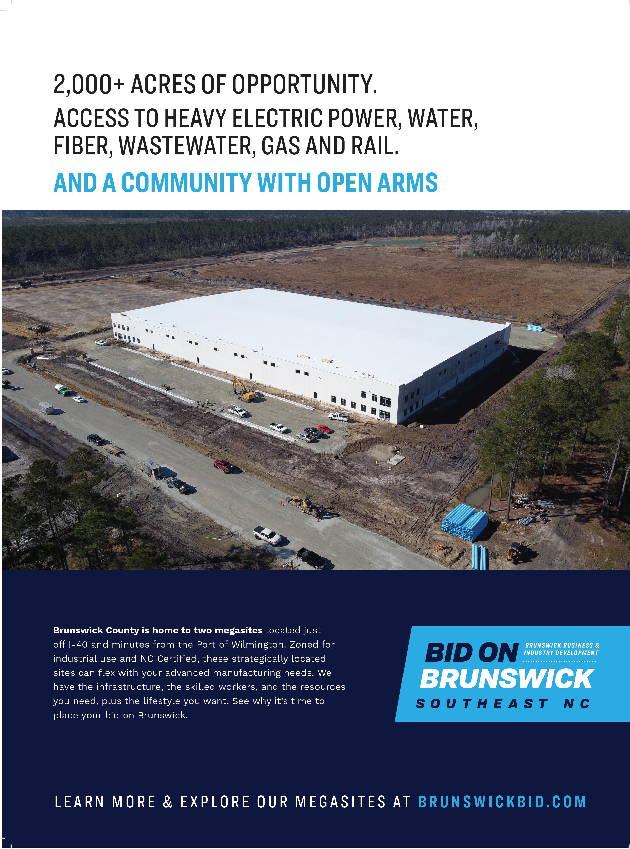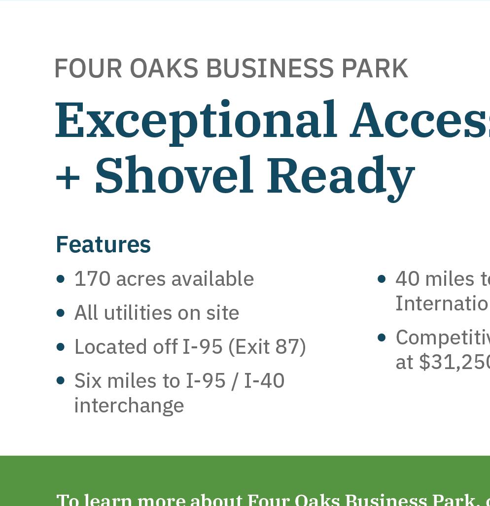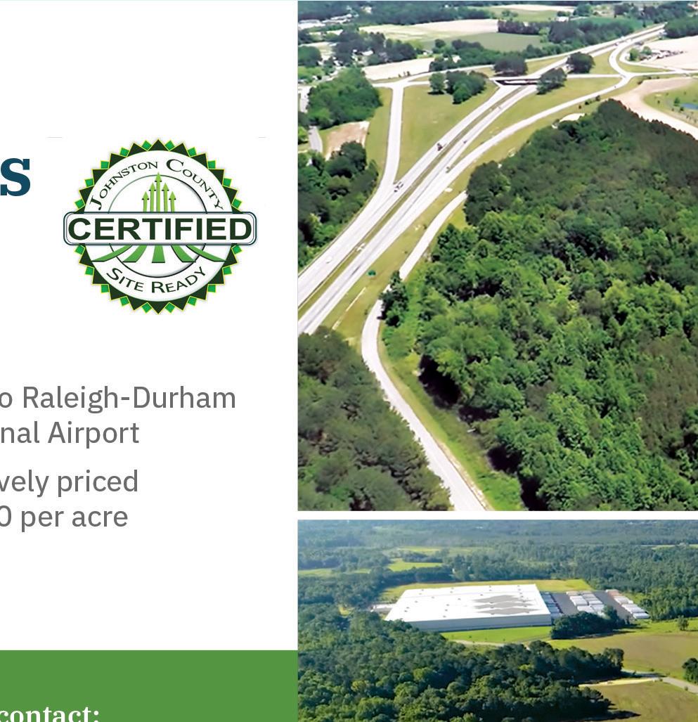 Edgecombe, New Hanover and Randolph counties, are shovel ready — utilities, access to rail, road and airports, and other necessities are already in place. “Everything that drives our conversations with companies looking to locate new operations is all about speed to market and risk reduction,” she says. “So, having sites and buildings or real estate options that are ready to go helps [companies] feel confident that part of the work has already been done or is scheduled.”