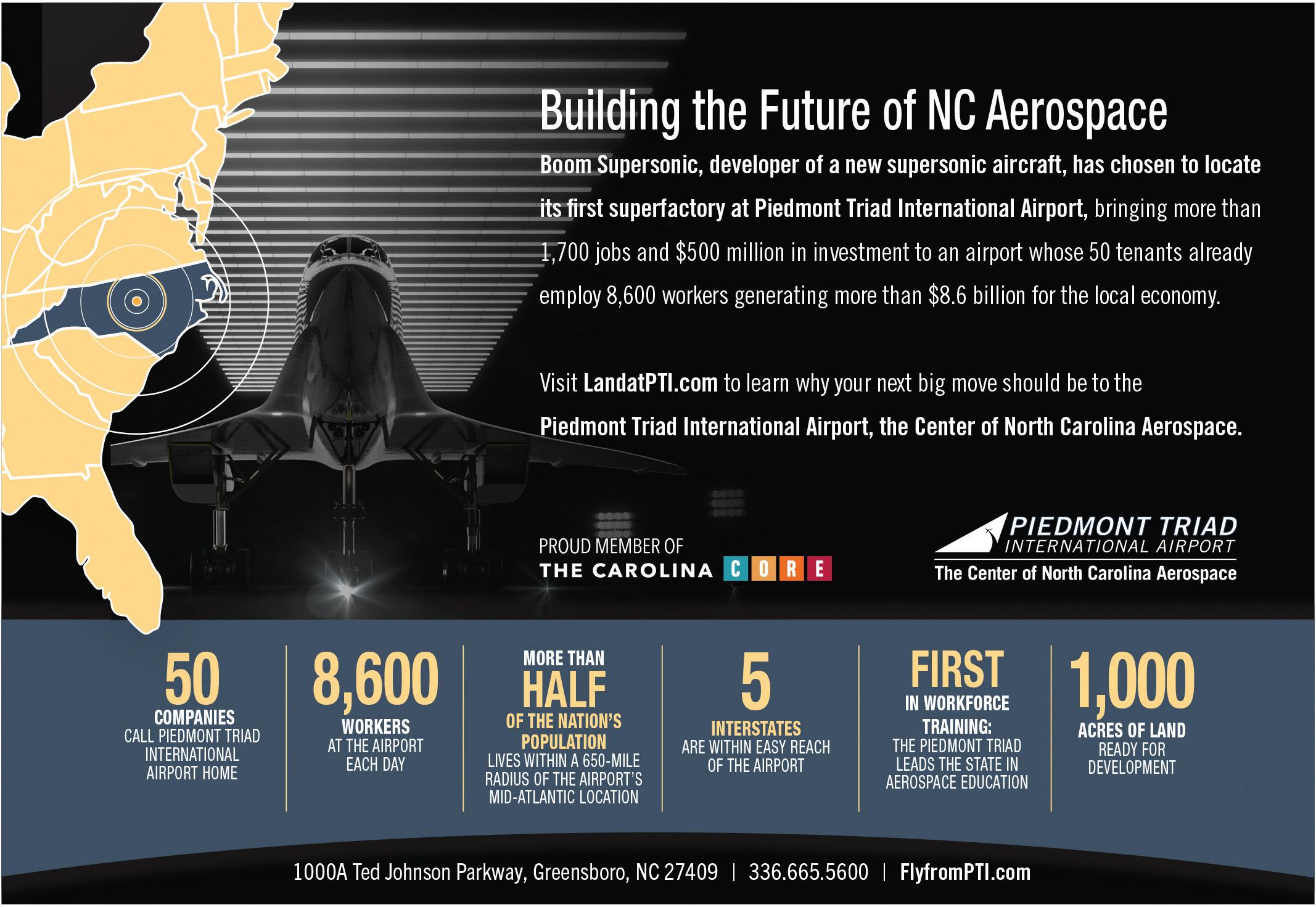 It was a busy two months for North Carolina economic development news. Toyota announced it was building a $1.3 billion lithium-battery factory at the 1,800-acre Greensboro-Randolph Megasite in December. It’s expected to employ about 1,750 people and help meet growing demand for electric vehicles. About a month later and roughly 30 miles away, Boom Supersonic unveiled plans for a $500 million commercial aircraft factory, which will create almost 1,800 jobs initially, on Piedmont Triad International Airport’s campus.