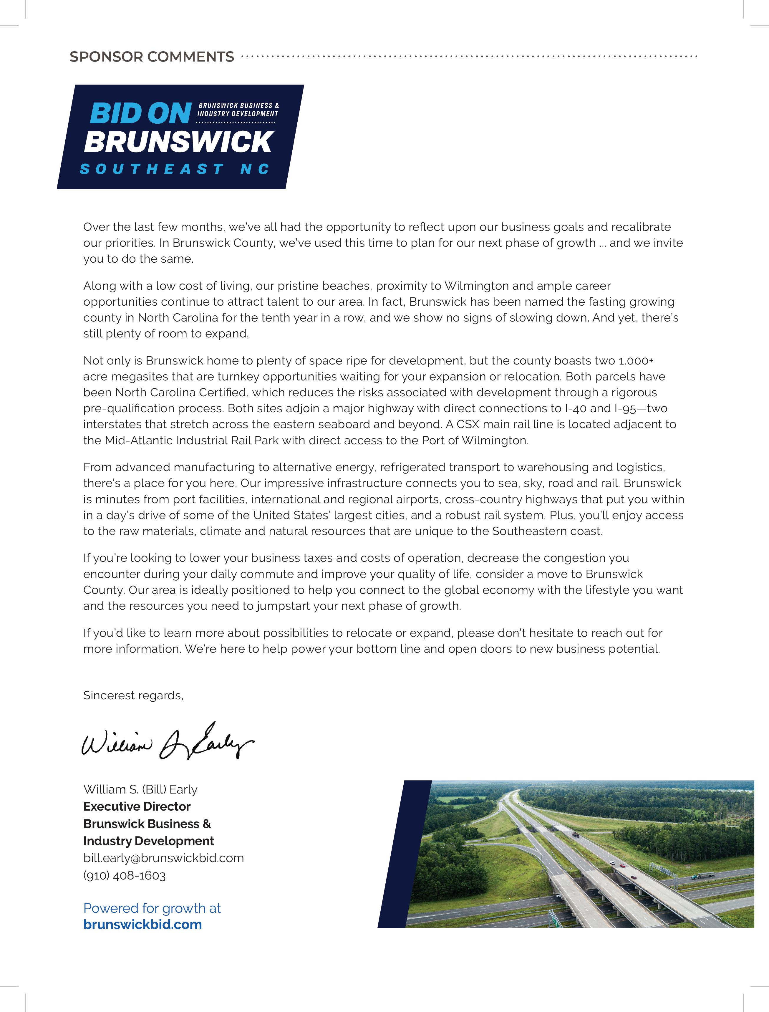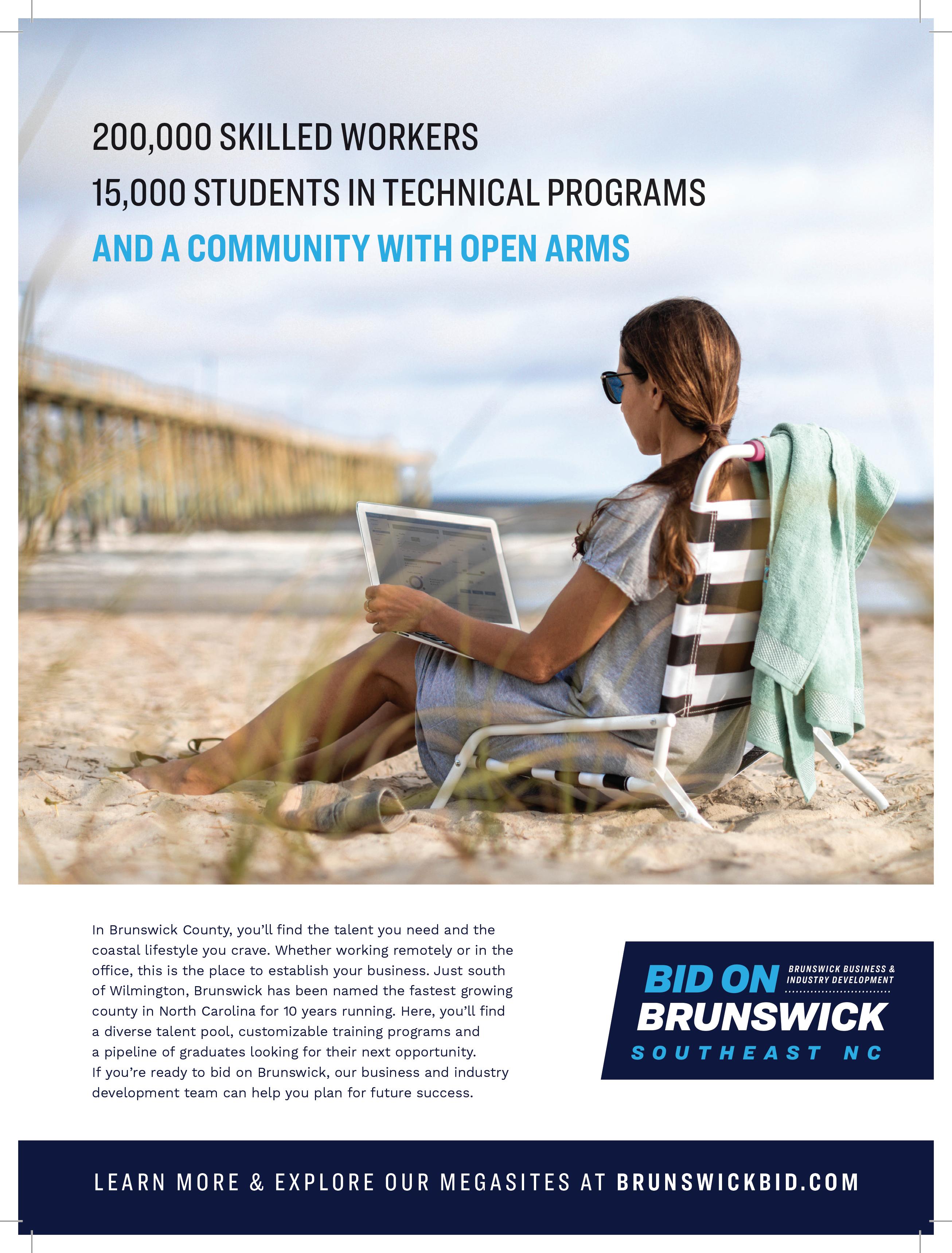 “While [they] are prime megasite locations within Brunswick County, we look at development potential throughout the entire county,” he says. “Target industries for Brunswick County include significant rail and heavy infrastructure manufacturing companies, warehousing and logistics, food processing and marine trades.”