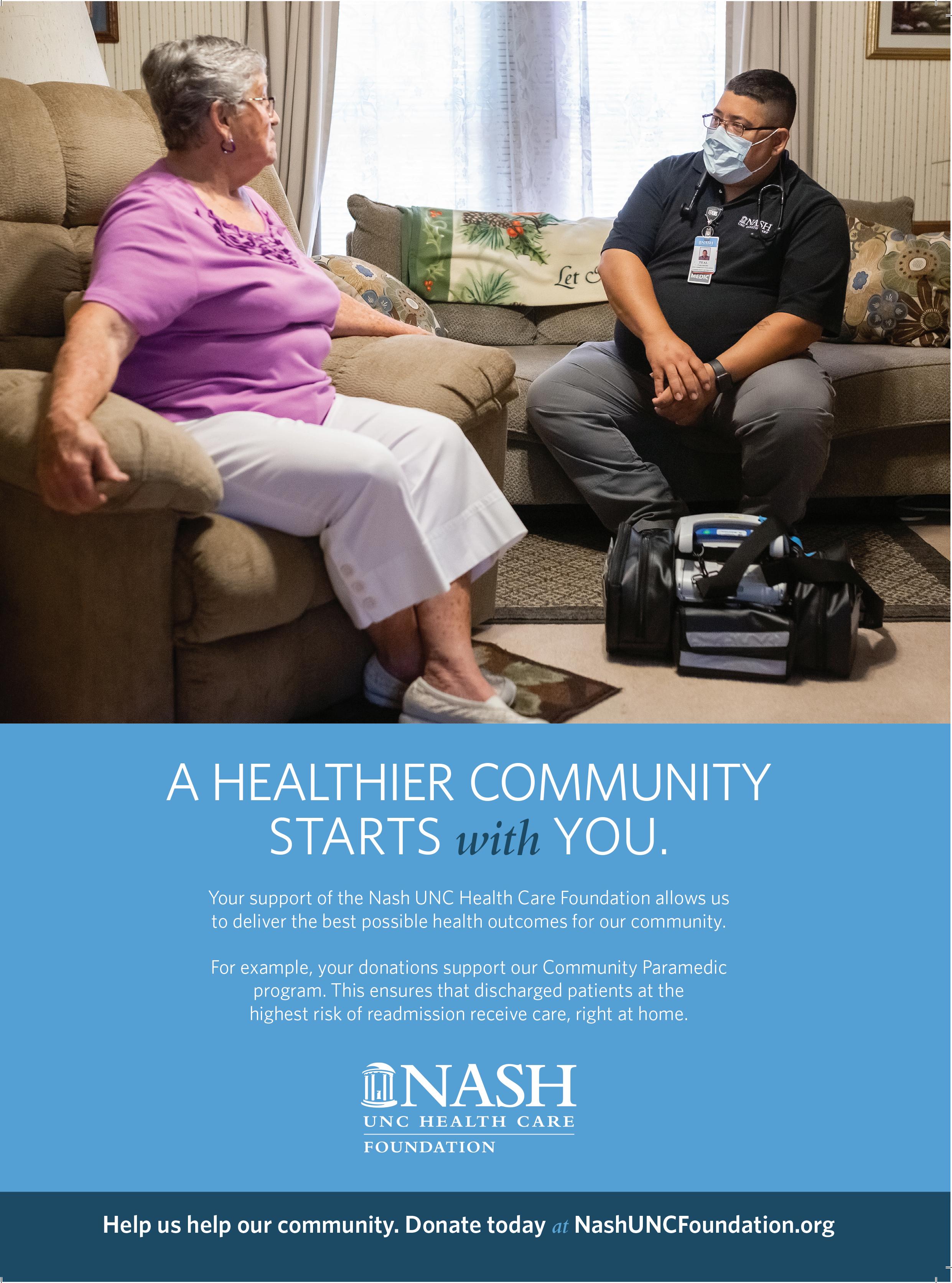 Nash UNC Health Care, which operates 280-bed Nash General Hospital, outpatient provider Nash Day Hospital and a variety of specialty centers, has initiatives to make care easier to access in a social-distancing society. A community paramedic program, for example, began last September and is funded by grants to the Nash UNC Health Care Foundation. It provides at-home care for high-risk patients, including ongoing home wellness visits to check vitals and discuss care,