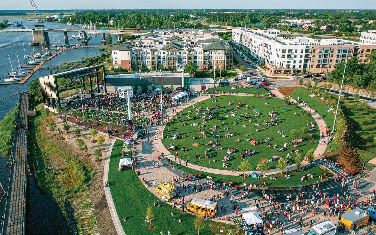 Rocky Mount Mills, 82 acres of mixed-use development at the site of the state’s second oldest cotton mill, stands next to the Falls of the Tar River. It’s home to entertainment venues, office space, restaurants, retail and residential. “[It’s] fully leased out on the residential village part,” Farris says. “The mill homes have been restored. It looks like a Norman Rockwell painting, and the suites and offices that overlook the river are like