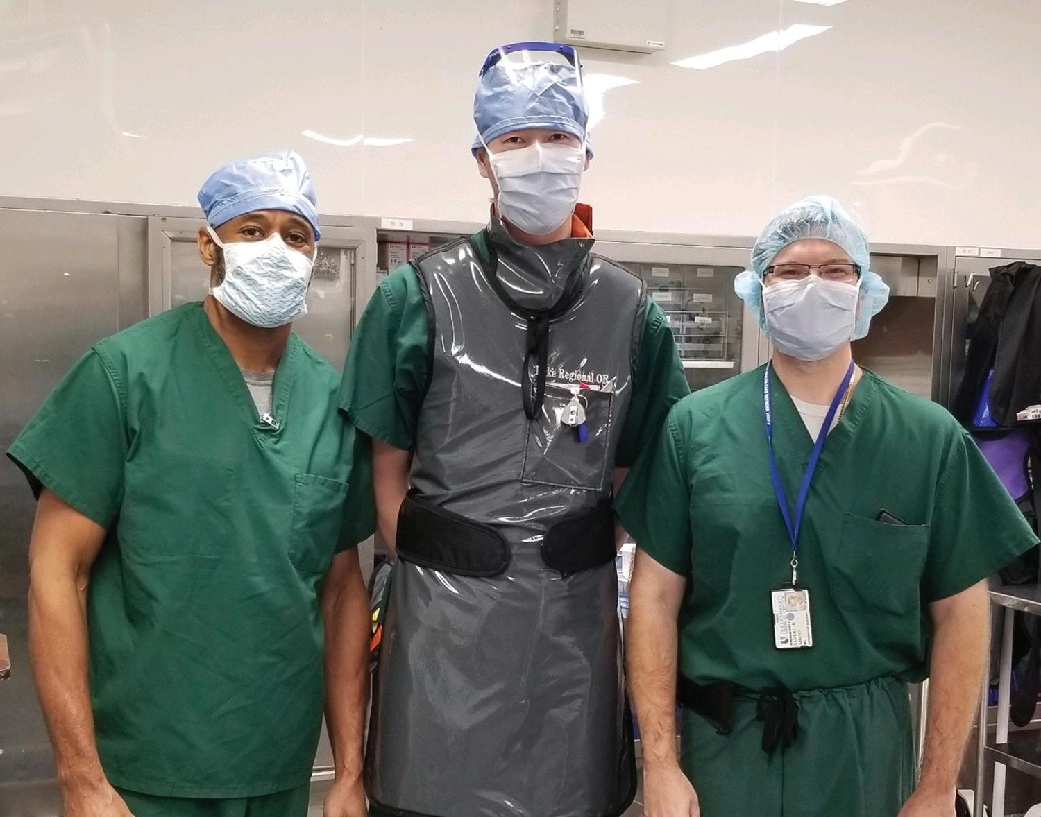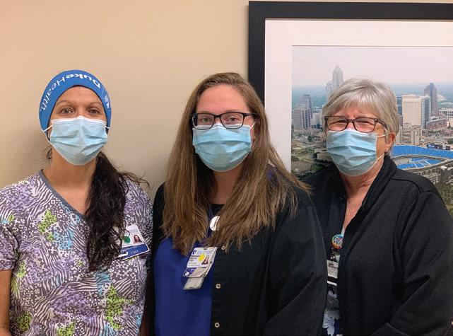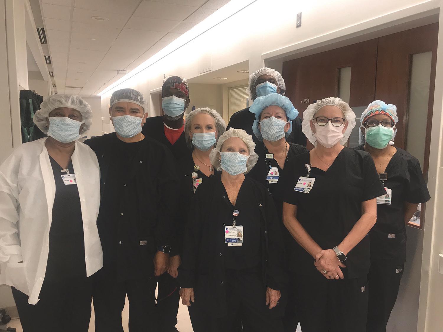 Sandy Glover, surgical tech; Jude Bayog, RN; David Lett, Jr, room attendant; Tammy Oakley, radiology tech; Shelby Infinger, RN; Chris Robinson, surgical tech; Joanne Wightington, RN; Donna Staton, surgical tech/scheduler; Yovonne Sullivan, surgical tech Top right (above): Brice Person, CST; Nikki Long, RN; Dana Norvell, staff assistant | Top right (below): Joe Guo, BSN; Rachel Chandler, physician assistant; Beca Jenkins, RN Middle left (above): Roseta White, CMA; Denice Perry, RN, Theresa Parker, RN | Middle left (below): Todd Gressick, radiology technician; Carmen Lacson, scrub RN; Anjanette East, CSTIV | Middle right photo: Dela Adams, medical assistant; Tam Huynh, PA-C; Shauna Ebron, medical assistant; Darphine White, financial care counselor; Monica Machiarrulo, athletic trainer; Marsha Hocutt, surgery scheduler; Kristiina Lugus, athletic trainer; Zachary Herron, PA-C; Axel Melendez, athletic trainer