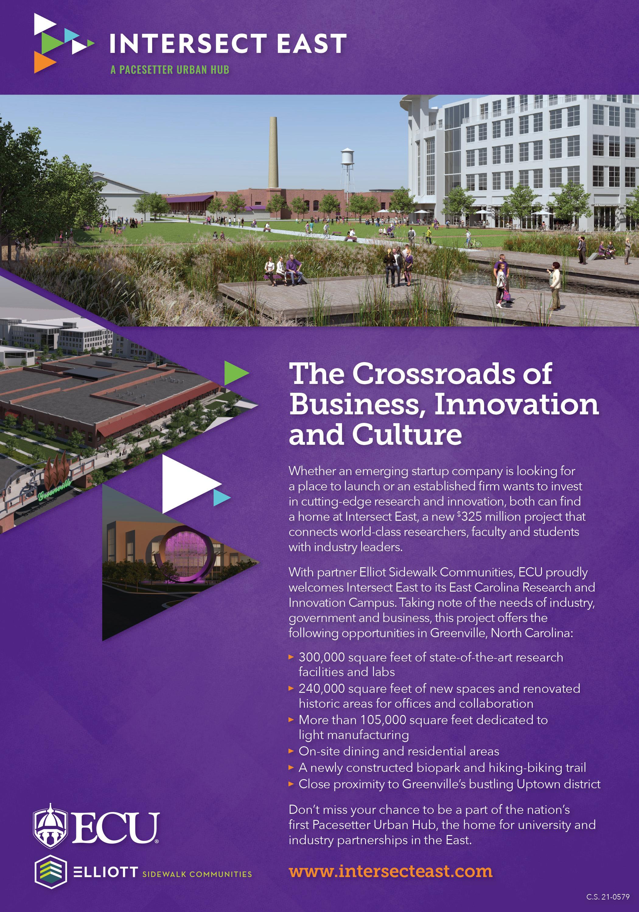 Developer Elliott Sidewalk Communities and partner East Carolina University are developing 19 acres, including three historic buildings on campus, into a project called Intersect East, which will be a catalyst to drive economic development and growth in Greenville, Pitt County and North Carolina.