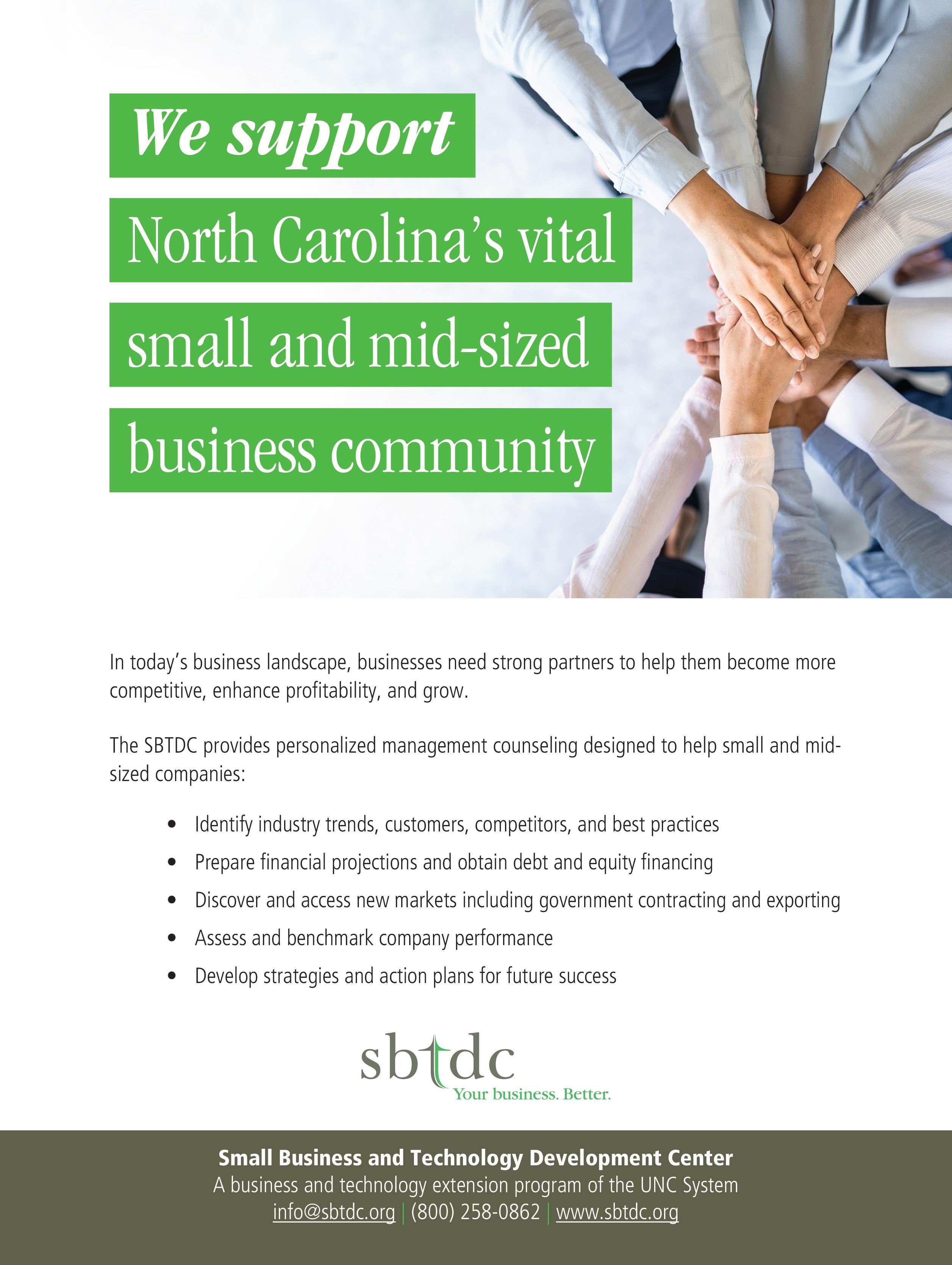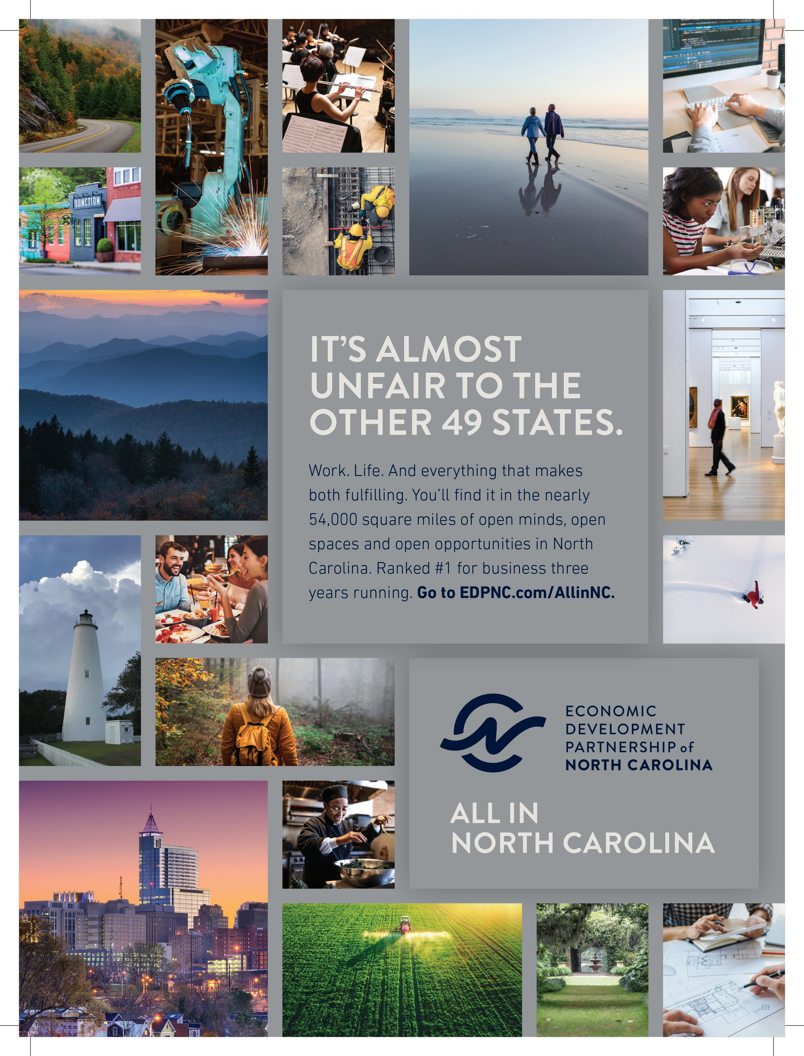 The Economic Development Partnership of North Carolina helps companies of all sizes identify sites, navigate economic development incentives, find workforce solutions and more. If you are interested in locating or growing your business in North Carolina, call 919-447-7744, email clientservices@edpnc.com or visit edpnc.com.